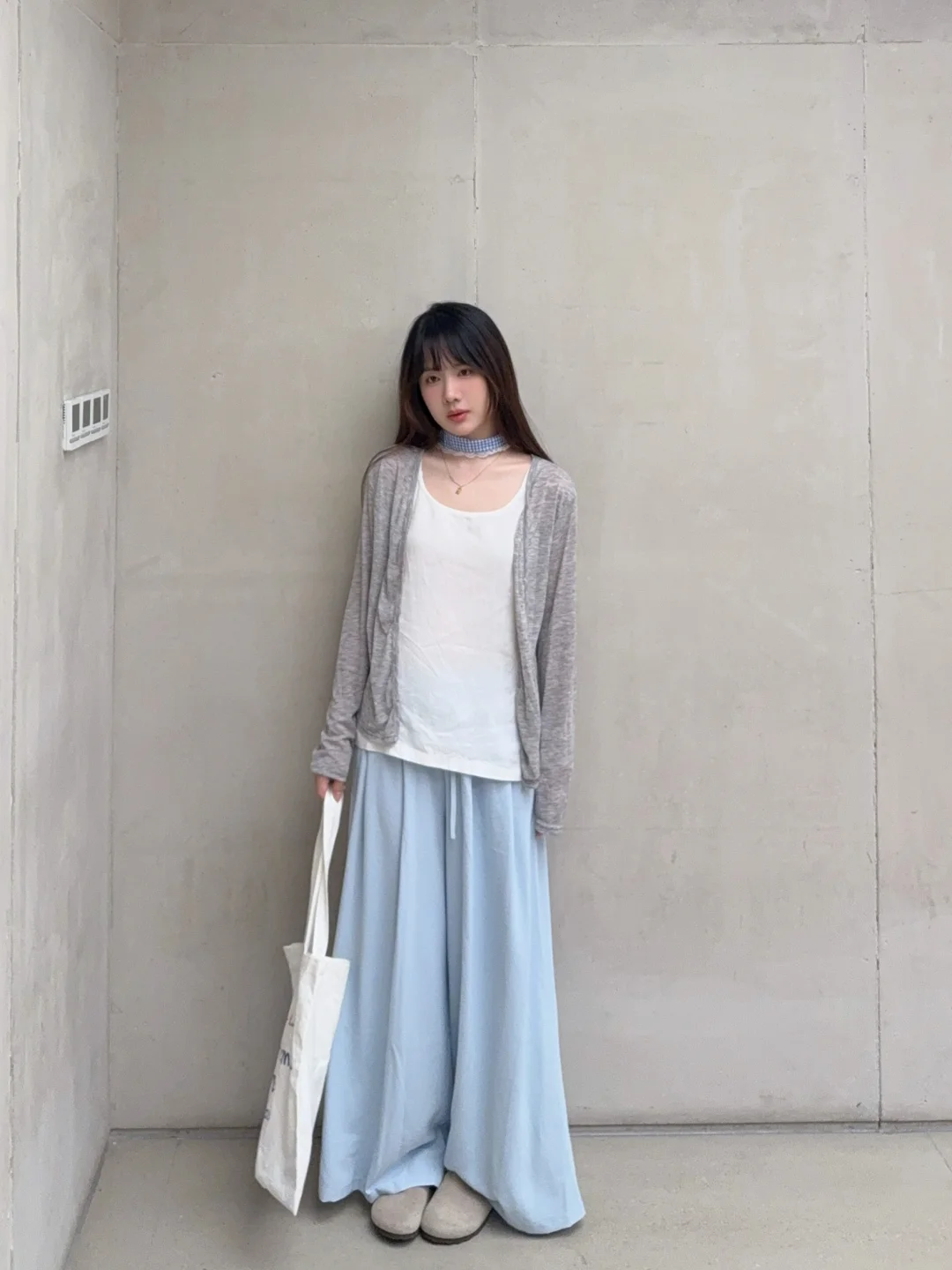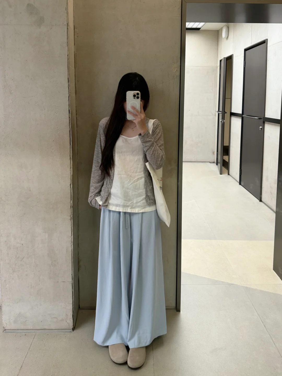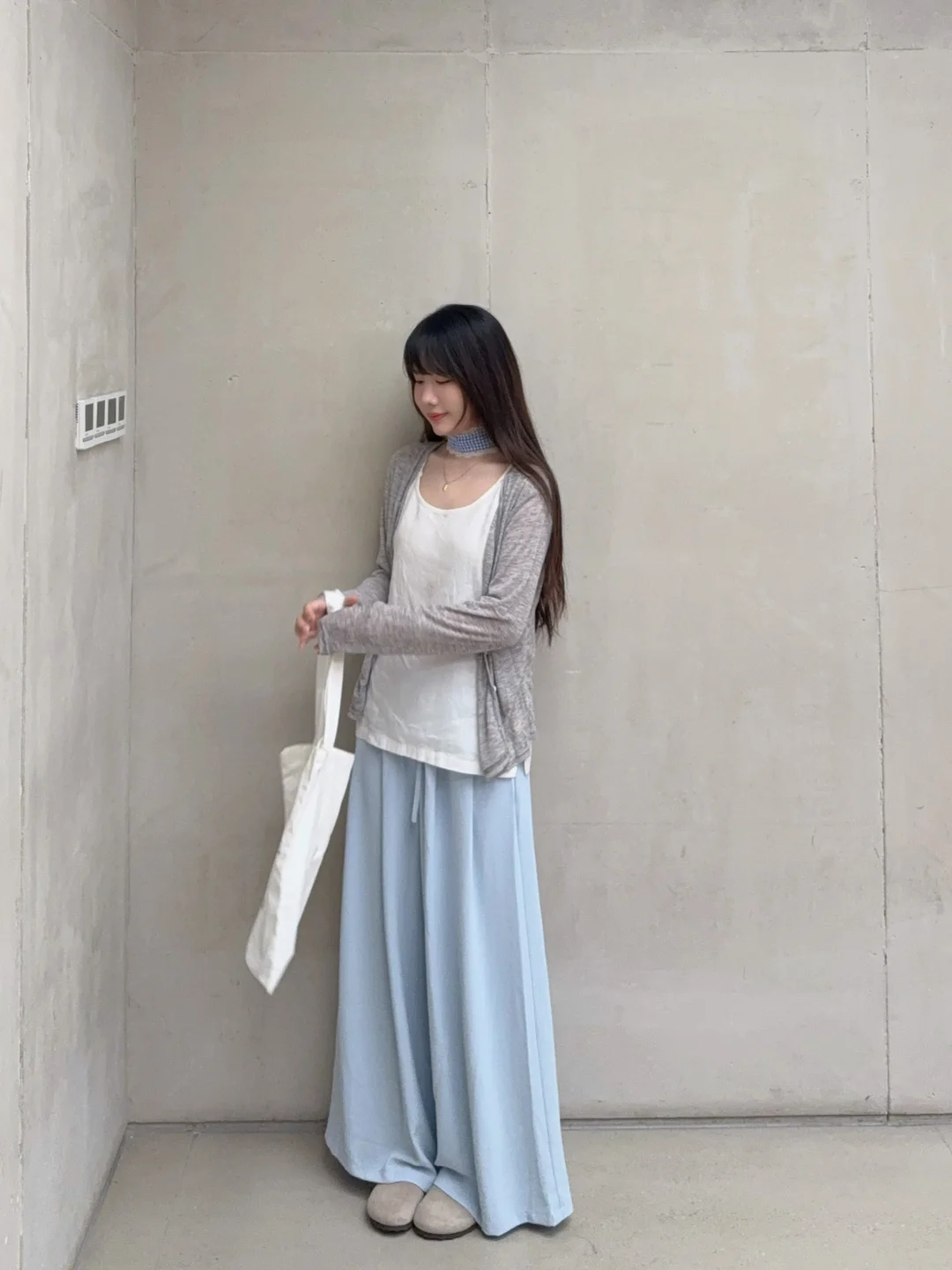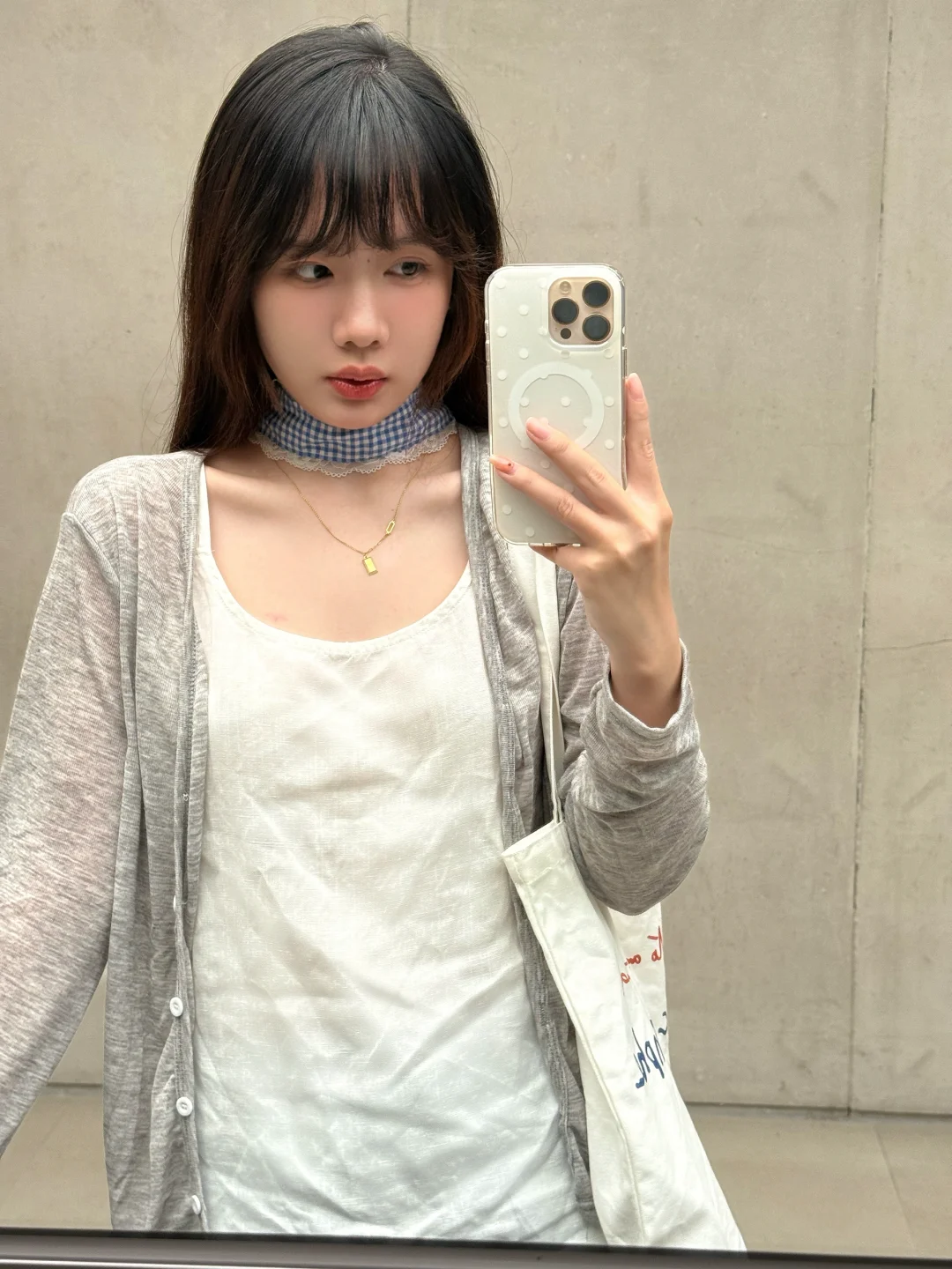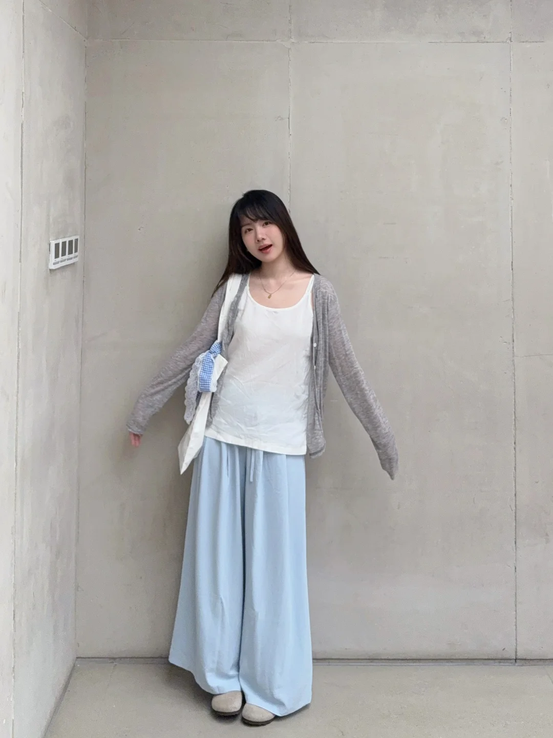 开衫➕背心 我觉得虽然室外有点热但是确实很防晒而且很遮肉显瘦 在室内空调房又很舒适