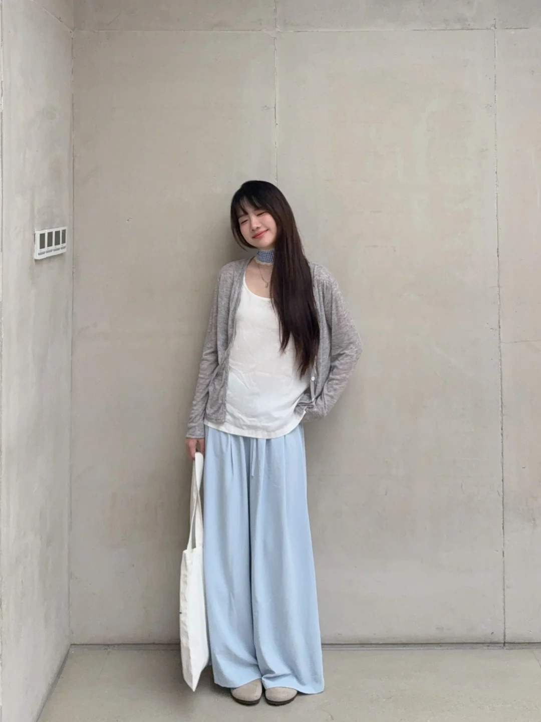 灰色/黑色开衫➕白色吊带背心➕低饱和粉色蓝色紫色的下装➕勃肯鞋/德训鞋➕帆布包