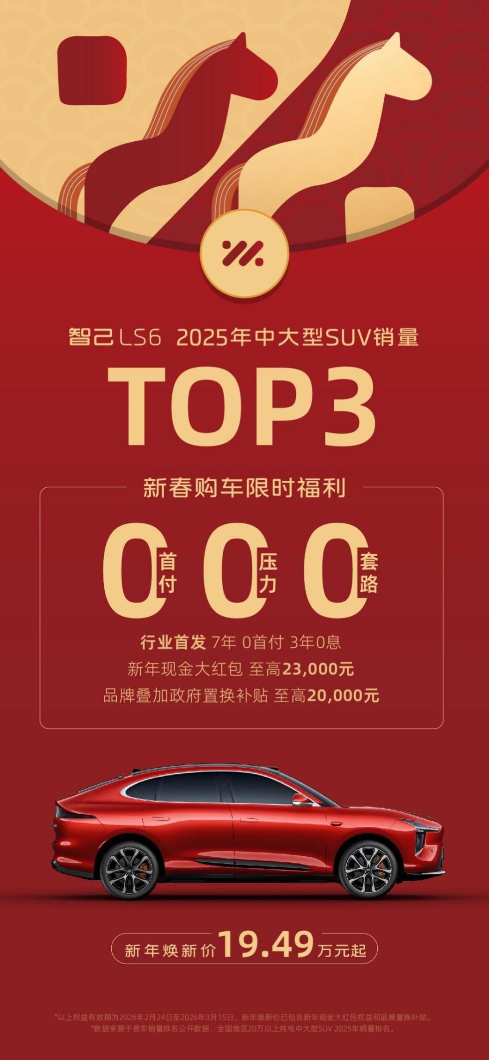 春节复工第一天,智己就来搞大事送福利了!2月24日,智己汽车官宣真7年、真0首付、真前3年0息政策,超级置换补贴至高20000元,7年真补贴加持下总利息比友商直省1-2万+!作为20万级最香最满配的100度电SUV,春节后换车的朋友,选智己LS6真的血赚不亏,闭眼冲就对了! 0套路、0利息、0首付,每一项都实打实! 不同于友商“短期补贴、隐性绑定”的套路,智己LS6推出7年超长贷政策,前3年0息、0首付,3年后还能提前还清,没有违约金,完全0套路,而且只有特斯拉&智己是国有银行方案!并非融资租赁公司,总利息更比友商省1-2万+,此外,还有新年现金大红包23000 元,外加1.5万政府置换补贴+5000元品牌超级置换补贴(增程)/6999官方桩(纯电),实打实让利车主! 智己LS6全系均享受本次7年0首付补贴,以智己LS6纯电Pro车型叠加品牌新春购置税补贴后价格,月供低至2320元,新年买智己购车无压力! 续航、补能、安全全在线 智己LS6纯电版车型拥有76度与103度两种电池规格,CLTC纯电续航分别达650km、750km和802km,覆盖日常通勤至中长途出行全场景,更搭载875V高压快充平台,10%-80%充电仅需16.8分钟,彻底打消纯电用户 “补能慢、续航短” 的顾虑。 操控、舒适、智能全方位满配 智己LS6智己LS6坚持“入门即顶配”,超百项顶级配置全系标配,智己LS6标配灵蜥数字底盘2.0,搭载同级唯一的双向18°后轮转向功能,转弯半径低至4.79米,实现“指哪打哪”的精准操控。IM AD高级辅助驾驶系统,由Momenta满血赋能,无图城市NOA全国通用,开长途很实用,有辅助驾驶人能轻松很多。另外,加上一键AI代驾可解决贴边、脱困、循迹等泊车难题,新手也能轻松驾驭。 总之,智己LS6续航碾压、价格更香,更有现车立提、无需熬夜排队的优势,新年买智己,入手无压力,预购从速!