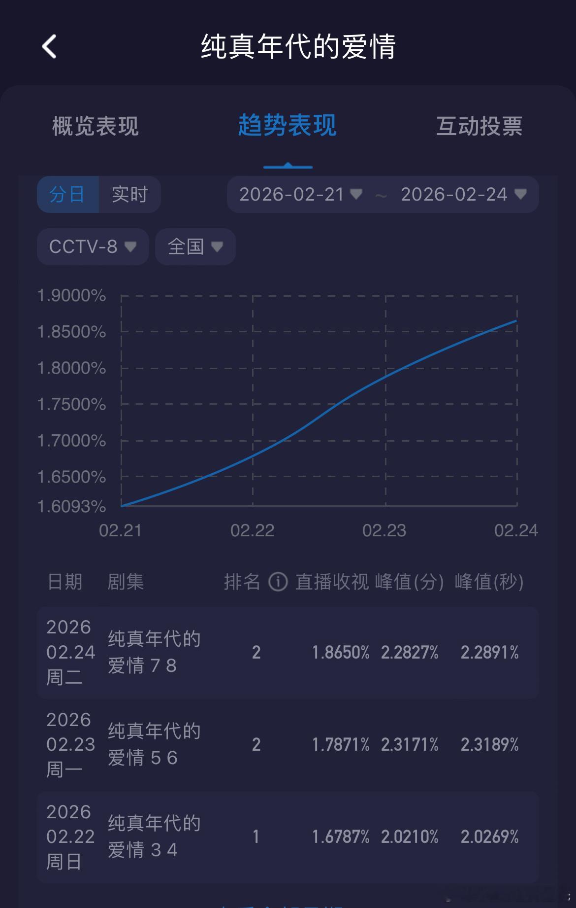 陈飞宇、孙千纯真年代的爱情收视率连涨三天酷云收视率从开播的1.6093%涨到了1.8650%,狠狠打脸《生命树》粉说的《春节档影响收视率》。