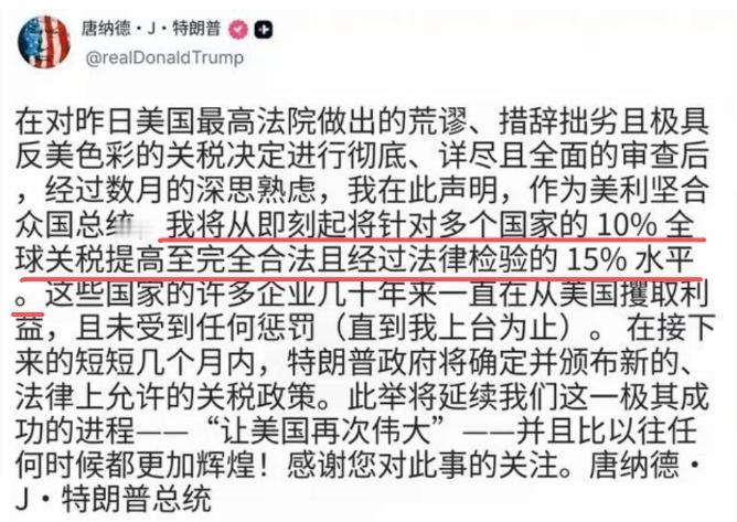 大家发现没有,从10%再到15%,全世界都不搭理了,不仅我们一句话不说,欧盟日韩也都只是,象征性的发个声明。这意味着什么? 特朗普这波15%的全球关税,看着来势汹汹,实则早没了第一任期的威慑力,各国之所以平静,核心是这根“大棒”早就没了当初的分量。 首先得说透这关税本身的硬伤,它不是什么长期政策,而是为期150天的临时措施,依据的《1974年贸易法》第122条此前几乎没被动用过,本质是特朗普绕开最高法院裁决的权宜之计。 最高法院刚判定他之前靠《国际紧急经济权力法》征税违法,他才紧急换了法律依据,这就意味着这15%的关税连合法性都还在打问号,能不能撑过150天都是未知数。 毕竟还需要国会批准延期,而共和党内部对关税本就有分歧,传统上共和党一直标榜自由贸易,不会轻易配合这种激进政策。 更关键的是,经过第一任期的教训,全世界都看清了关税的真实成本谁在承担。美联储早就明确过,加征关税的绝大部分成本不会由外国出口商买单,最终都会落到美国消费者和企业头上。 第一任期时,美国物价被关税推得持续上涨,企业生产成本飙升,这些苦头美国自己尝够了,这次各国心里都有数,没必要浪费精力抗议,反正最后埋单的还是美国人。 而且这次关税是统一税率,不像之前针对性打压,有些国家反而从中受益,比如中国之前承受的关税税率比15%还高,这次反而降了7.1个百分点,巴西、印度等国也有不同程度的税率下调,真正被加税的国家冲击也有限,欧盟、日韩的税率仅小幅上升0.4到0.8个百分点,这种程度的调整,实在没必要大动干戈。 这些年各国早就悄悄做了准备,对美国市场的依赖度已经大幅下降。全球供应链多元化不是空话,而是实实在在的行动。 加拿大对美出口已经连续下滑,对非美伙伴的出口却增长了17%以上;德国对美出口回落至2022年水平,转而开拓南美、印度等新市场; 中国更是早就减少了对美市场的依赖,亚洲对美整体出口能保持稳定,靠的就是货物通过东南亚转口,柬埔寨、越南等国的转口贸易大幅增长,有效对冲了直接出口的下降。 各国不再把美国市场当成唯一选择,自然就不怕关税威胁,你加你的税,我照样能把货卖出去,只不过换了个渠道,这种情况下,抗议反而显得多余。 特朗普的政策可信度也早就透支了。他的关税政策向来反复无常,之前威胁要对金砖国家征100%关税,对东南亚征49%关税,最后都不了了之,要么谈判降税,要么不了了之。 这次从10%涨到15%,看似强硬,实则还是老套路,先喊高价再留谈判空间。各国都摸透了他的路数,知道这更多是政治作秀,尤其是在需要国会支持的背景下,最终落地的力度可能大打折扣。 而且他身边的团队虽然多是对华强硬派,但关税作为谈判工具的本质没变,150天的期限本身就是留了谈判窗口,各国没必要在一开始就把关系搞僵,象征性表态一下,静观其变才是最划算的选择。 全球经济环境也让各国懒得纠缠贸易摩擦。2024年世界经济本就增速放缓,发达经济体增长乏力,欧盟经济仅增长0.8%,大家都在忙着稳增长、保市场,没精力再搞针尖对麦芒的抗议。 而且经过多年贸易战,各国都积累了应对经验,企业学会了通过调整定价、优化供应链、转口贸易等方式消化关税成本,就算关税生效,也能把影响降到最低。 比如东南亚国家面对关税,靠承接中国的投资和转口贸易,出口反而逆势增长,这种韧性让各国更有底气保持平静。 还有一个容易被忽略的点,就是美国自身的经济软肋。美国现在面临通胀回升、债务问题恶化等风险,美联储因为关税推升通胀,连降息都不敢轻易动手。 如果关税长期持续,只会进一步加重美国经济负担,拖累消费和就业。各国都看清了这一点,特朗普的关税大棒看似指向别人,实则对准的是美国自己的软肋。 这种情况下,与其抗议,不如让市场和美国民众自己感受关税的负面影响,这种沉默的应对,反而比激烈的抗议更有力量。 说到底,各国的平静不是示弱,而是底气足够。关税的合法性存疑、期限短暂,成本由美国自己承担,再加上各国供应链早已多元化、对美依赖下降,特朗普的政策又缺乏可信度,这些因素叠加起来,让这波关税失去了实际威慑力。 大家早就不是第一任期时那个没准备的状态,现在既有应对的办法,又看清了政策的本质,自然没必要再浪费口舌,平静背后,其实是全球贸易格局的悄然变化,也是各国应对能力的全面提升。
