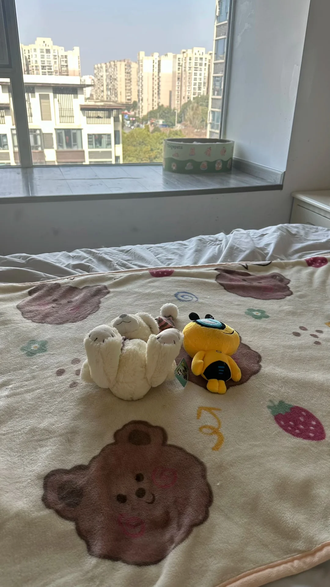 然后有一天我发现给他们放在床上的娃娃居然到了客厅(后面也发现几次)想必是自己叼出来玩了。当时眼眶一下子还有一点涩(本人比较容易哭)