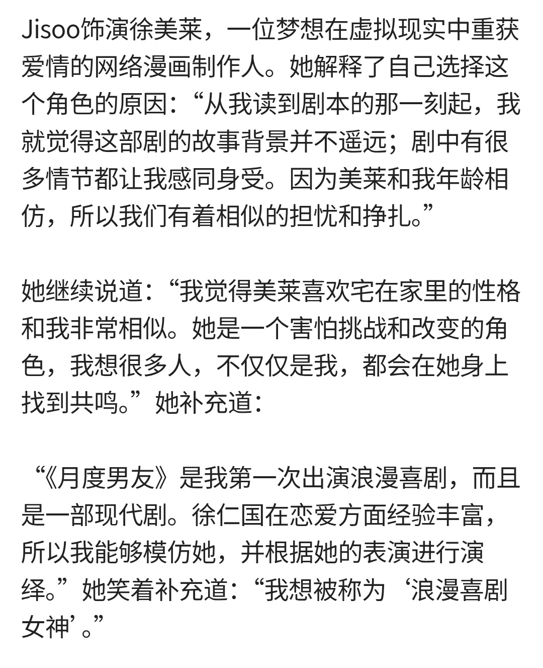 金智秀出席月刊男友发布会Jisoo《月刊男友》新闻发布会采访相关💕智秀在剧中穿了200多套服装!🐰:“我不知道我以前有没有穿过这么多衣服。因为造型和主题各不相同,我觉得观看体验也会很有趣。” 103%期待中!!!