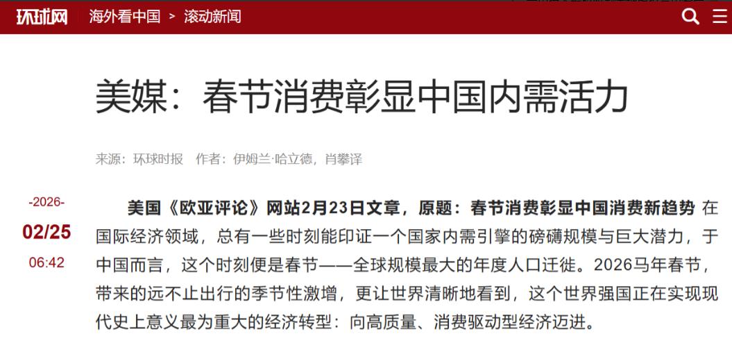 确实没想到,中国的春节结束了,但外媒的讨论才刚刚开始!首先是马来西亚《星报》,它发现春节期间,中国各领域消费活动强劲,旅游、餐饮、娱乐和零售等行业消费旺盛,全国重点零售和餐饮企业日均销售额,较2025年春节同期增长10.6%。 马媒的话很多人也有感受,今年大家请客不怎么在家做饭了,而是去饭店包席,好吃又省事,对餐饮消费大涨有很大助力。 春节聚餐从家庭厨房,转向餐厅包厢,本质是时间成本与体验价值的,重新权衡。 过去春节请客,采购、清洗、烹饪、洗碗的全流程,往往耗费一整天;如今大家更看重团聚本身的质量,不愿将假期时间浪费在繁杂家务上。 餐厅包席恰好解决了这一痛点,让聚餐回归纯粹的陪伴与交流。这种需求转变背后,是生活节奏变化与消费观念的升级: 人们不再将“亲自下厨”等同于重视,反而认为专业的餐饮服务,能提供更稳定的口味,和更轻松的氛围,这种认知转变,让外出聚餐从“可选”变成“刚需”。 家庭聚餐成为餐饮消费的绝对主力,也让行业供给发生了针对性调整。餐饮企业不再执着于高端商务套餐,转而聚焦家庭需求,优化套餐结构,降低客单价的同时保证品质。 通过供应链升级,提前锁订食材价格,建立区域总仓储备核心食材,避免春节期间原材料波动影响菜品和价格; 线上预订系统的完善,也让包席更省心,提前锁定餐位、线上预点餐,到店直接上菜,减少等待时间。 这种“确定性”体验,成为吸引消费者的重要因素,大家不用再担心食材准备不足、烹饪失误,也不用纠结点菜价格,明码标价的套餐让消费更透明。 地方菜的崛起为包席消费增添了新动力。除夕当天,地方菜团购订单量同比增长343%。各地餐饮企业深挖本地风味,将非遗技艺融入菜品,让包席既有烟火气又有文化感。 这种地域特色满足了,家庭聚餐中“尝鲜”与“怀旧”的双重需求,也让外出就餐更具记忆点。 同时,餐饮企业推出的3-6人小家庭套餐,适配不同家庭规模,避免浪费的同时提升性价比,进一步降低了家庭包席的决策门槛。 反向过年与旅游热潮的叠加,让餐饮消费突破了地域限制。父母进城团聚,让一线城市从春节“空城”变为消费热点,60岁以上农村游客在城市商圈的餐饮消费额,高于本地居民均值; 而“味蕾游”的兴起,让地方美食成为旅游目的地的核心吸引力,汕头、洛阳等城市的特色餐厅一座难求。 旅游与餐饮的深度联动,让春节餐饮消费不再局限于本地家庭聚餐,形成跨区域的消费合力; 三线及以下城市的下沉市场也被激活,返乡青年将一线城市的消费习惯带回县城,带动当地餐饮品质升级,团购销售额同比大幅增长。 预制菜与堂食包席形成互补,共同推动餐饮消费增长。超过六成消费者会选择成品或半成品年菜,将宴席中复杂耗时的菜品“外包”,既保留部分家庭烹饪的参与感,又减轻负担。 这种“半外包”模式,让餐饮消费场景更灵活,无论是餐厅包席还是在家小聚,都能享受便捷美味的年菜;而餐饮企业推出的可外卖年夜饭大礼包,进一步拓展了服务边界,满足了不同消费场景的需求。 消费观念的转变也为包席热潮提供了支撑。春节走亲访友的礼品消费下降,奢华礼盒销量暴跌,大家更愿意将钱花在体验类消费上; AA制结算在亲戚聚餐中占比接近七成,减少了请客方的经济压力,让外出包席的频次大幅提升。 这种理性消费趋势,让餐饮消费更可持续,也让更多家庭愿意选择餐厅包席这种省心又体面的聚餐方式。 餐饮行业的数字化与供应链升级,是包席消费能够规模化的底层支撑。 线上平台的团购、预订、支付一体化服务,让消费流程更便捷;餐厅通过企业微信提前对接顾客,优化备货与上菜流程,保证高峰期的服务质量;冷链物流的完善让食材新鲜度得到保障,跨区域采购让包席菜品更丰富。 这些看不见的升级,让消费者在餐厅包席的体验持续优化,形成良性循环。 春节餐饮消费的大涨,本质是消费需求与行业供给的精准匹配。饭店包席的流行,不仅是“好吃省事”的表层选择,更是时间价值、体验价值、性价比三者平衡后的必然结果。 这种变化背后,是整个餐饮行业从产品、服务到供应链的全面升级,也是居民消费观念从“重形式”到“重实质”的转变;旅游、交通等关联行业的联动,进一步放大了这种消费潜力,让春节餐饮消费成为观察消费复苏的重要窗口。 而这种增长趋势,也正在推动餐饮行业向更细分、更精准、更高效的方向发展,让未来的春节聚餐有了更多元的选择。