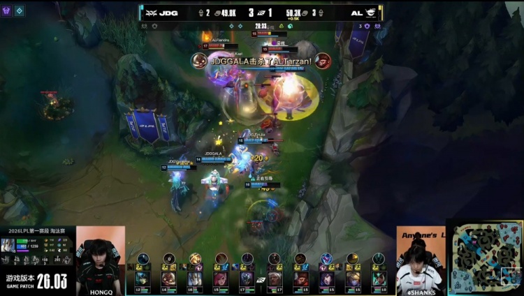 [18:52]AL三人推掉JDG中路一塔,Shanks狐狸下路闪现+走位逃生打出JDG中野辅三人闪现。