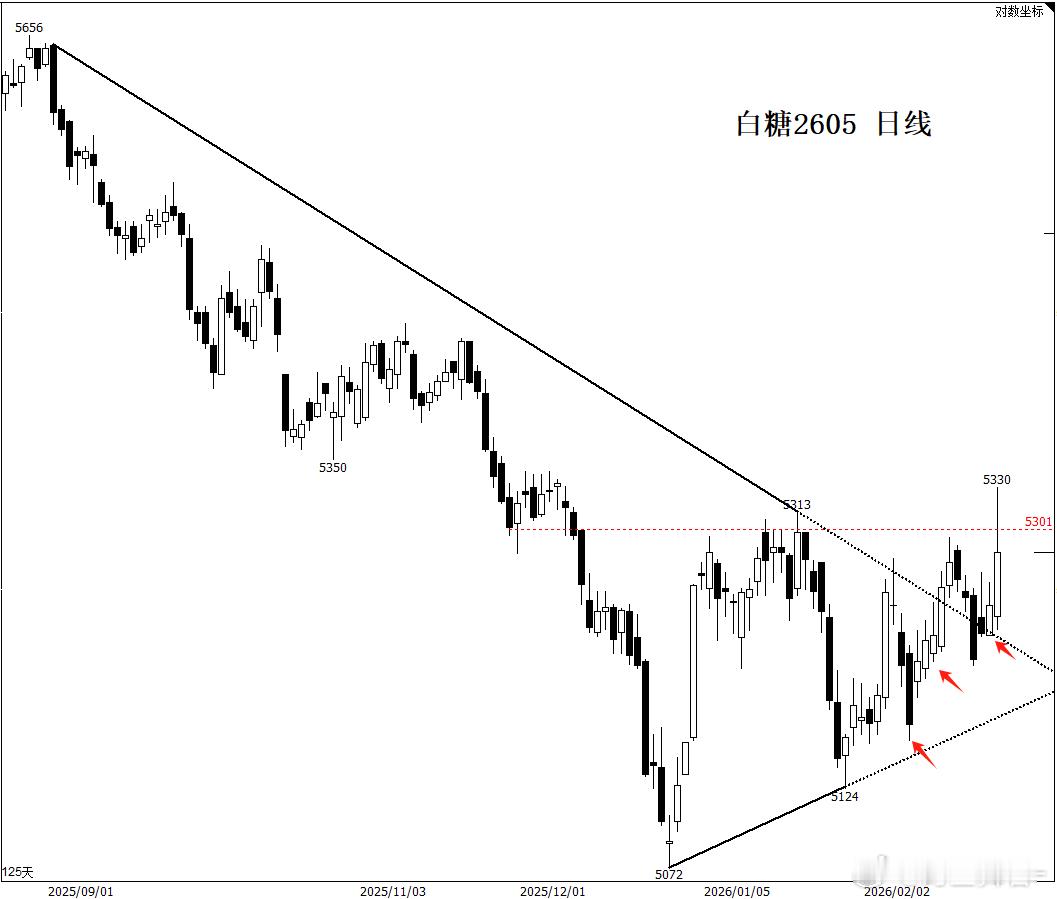白糖 多头值得关注:1、周线级别阶梯式下跌结束(图1所示),日线级别偏空逻辑(下降趋势线)弱化;2、日线级别跌势逆转——转为震荡,形态上是一个上边为水平(图2红色虚线所示),下边为向上倾斜的收敛通道,就形态而言是略微偏多的;3、低点逐步上移的斜率加大(图2红色箭头所示),意味着多头可能更积极的在利用回撤积累头寸。