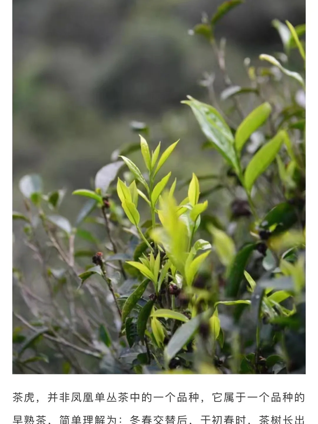 其实茶虎是指介于冬春交替之时,先长出来的新芽。具有雪片单丛茶的鲜香,高香,花香雪韵,茶形较粗壮,滋味又含有春茶的底蕴~