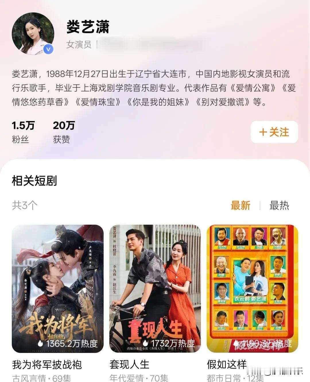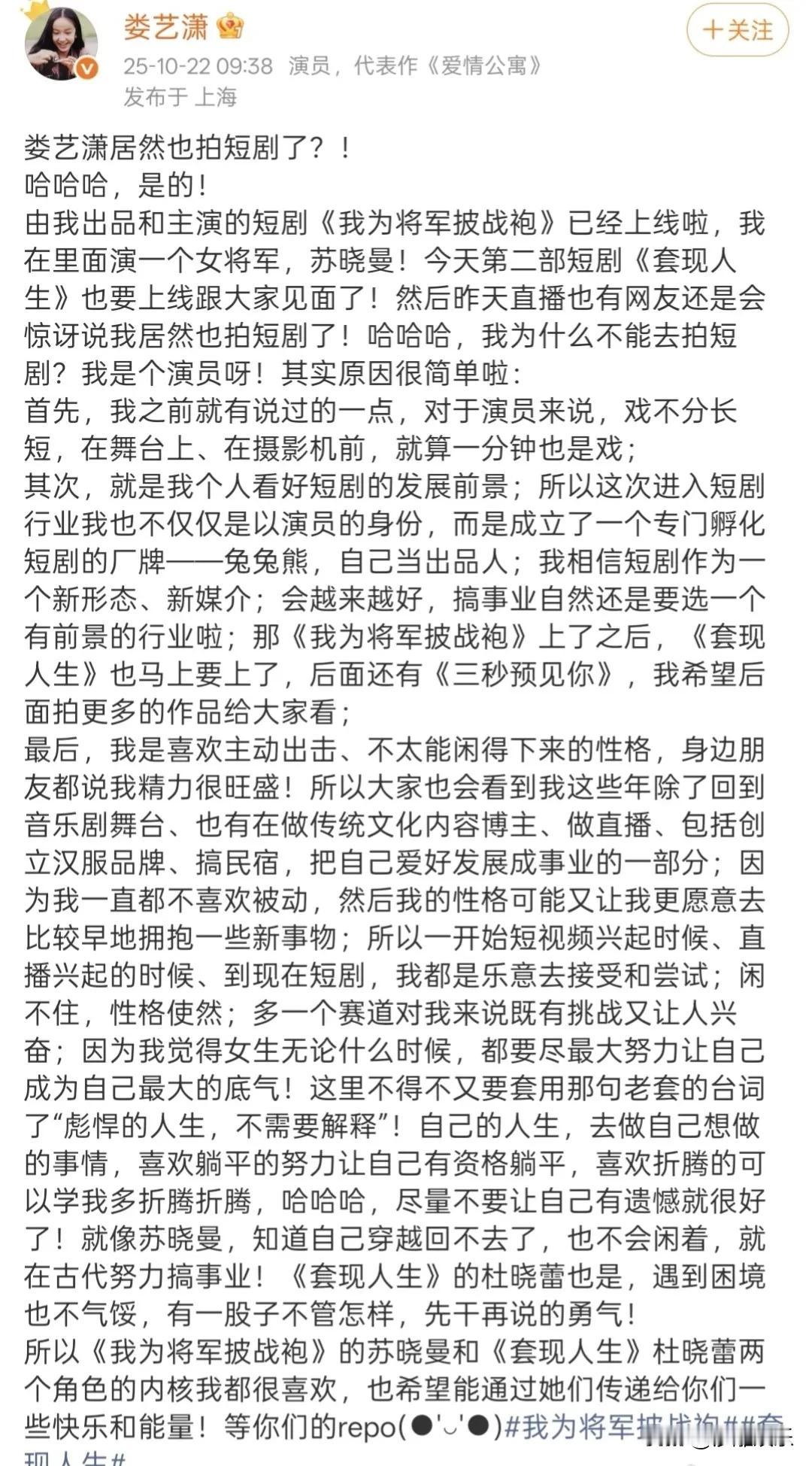 胡一菲诺澜在“短国”相遇!娄艺潇刘萌萌合体,演员降维打击还是新战场? 谁能想到,《爱情公寓》关服十年后,胡一菲和诺澜竟然在“短国”重逢了! 2月26日,有网友发现,娄艺潇和刘萌萌都杀进了短剧赛道。刘萌萌在《首富千金狂追二龙湖浩哥》里演豪门千金,虽然热度破了330万,但造型被吐槽“诺澜滤镜碎了一地” 。而娄艺潇不仅主演了《我为将军披战袍》,还直接升级当上了出品人,成立厂牌“兔兔熊”,被粉丝调侃:“彪悍的人生不需要解释,一菲直接在短国开宗立派了。” 其实早在年初,娄艺潇就被问过“演短剧是不是掉价”。她的回应特别真诚:“我不这么认为,从表演角度来讲,不管是长剧还是短剧,都要演得真、要走心。” 这话说到了点子上。现在的短剧早就不是我们印象里的“土味爽文”了,单集3秒反转、女将军复仇、异能影后逆袭,节奏快得飞起 。 说实话,看到胡一菲和诺澜在短剧赛道“同框”,挺感慨的。以前觉得短剧是草台班子,现在连科班演员都下场了。不是长剧演员“降维打击”,而是好演员正在给这个新赛道“提档次”。娄艺潇有句话特别对:“喜欢折腾的多折腾折腾。” 对于演员来说,观众在哪儿,舞台就在哪儿。短剧不是终点,认真演戏的人,在哪都发光。