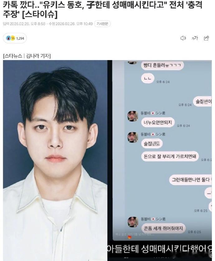 曝前UKISS成员东浩带儿子性交易前男团成员被曝出轨家暴不给抚养费 据韩媒,前U-KISS成员东浩遭前妻控诉出轨、家暴、不给抚养费等。东浩否认后,前妻再度发声,表示“他打孩子、把孩子带出去羞辱的事,以及孩子的证词我都会好好跟记者说清楚”,还公开了疑似东浩本人的聊天记录,“他说要带儿子去性交易。”
