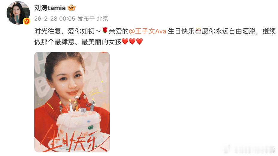 刘涛为王子文庆生:时光往复,爱你如初~🌹亲爱的生日快乐🎂愿你永远自由洒脱,继