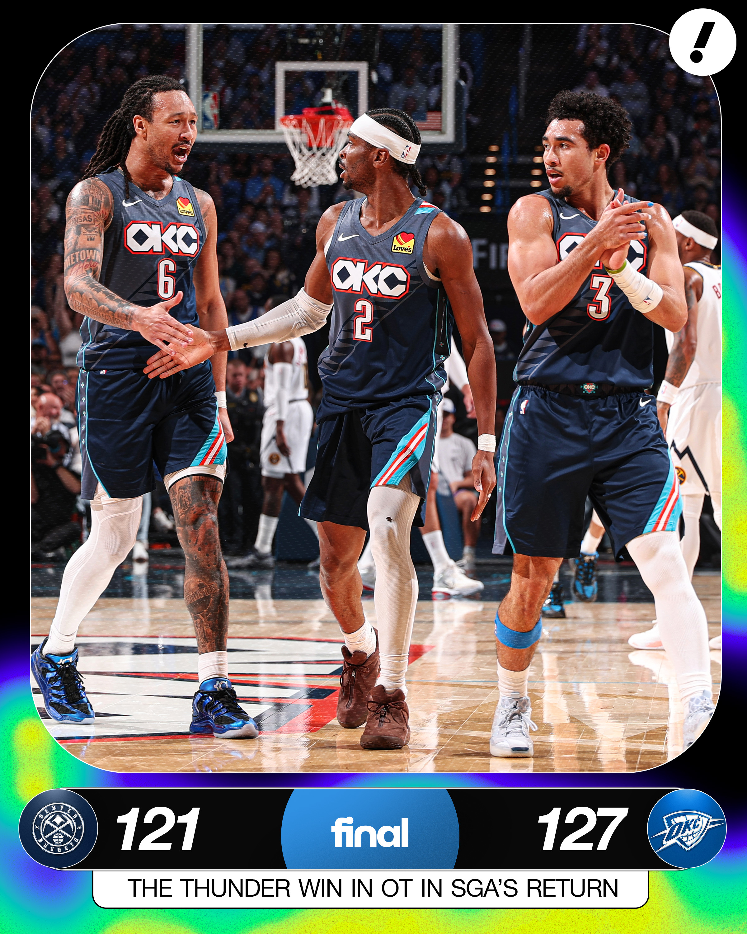 雷霆完成本赛季主场最大逆转(16分),加时击败了掘金。亚历山大复出立刻轰36分9助攻,霍姆格伦15分21篮板,篮板生涯新高,另外雷霆三大替补上双,乔也贡献9分。掘金这边约老师23+17+14大三双,穆雷飚了39分8篮板6助攻。