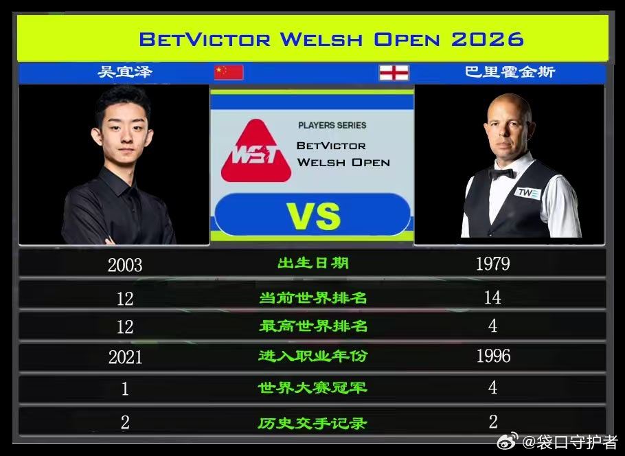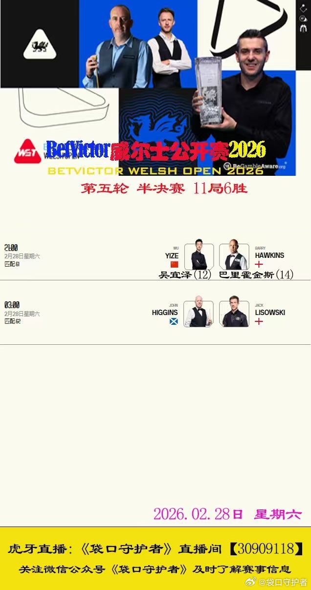 2026 BETVICTOR 成尔士公开赛 中国选手吴宜泽晋级半决赛;2026.2.28日 星期六 第六天 第五轮(半决赛)21:00 直播:吴宜泽VS巴里霍金斯