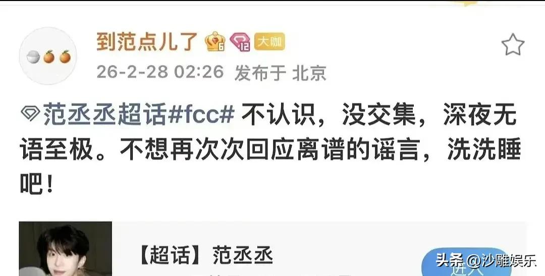 范丞丞,打工人式辟谣! 如果要问内娱哪家工作室的声明最能让人“感同身受”,以前可能各有千秋,但就在2月28日凌晨,范丞丞工作室直接封神了! 面对没完没了的恶意造谣,这次工作室没有长篇大论的律师函,也没有模棱两可的废话文学,仅仅用了12个字,却让全网打工人瞬间共情:“不认识,没交集,深夜无语至极” 。 短短三句话,情绪饱满。尤其是那个“深夜无语至极”,隔着屏幕都能闻到怨气。这哪是明星声明啊,这简直像极了我们半夜被工作群@,爬起来改方案时的暴躁心声 。 网友辣评:“晚一秒发出都是对半夜被无语到的辜负!” 其实这不是范丞丞第一次这么刚了。这次之所以引爆热搜,是因为同一个博主反复拿多年前的旧照做文章 。第一次大家忍了,发了长文解释;结果没完没了了?那就别怪工作室直接开启“暴躁打工人”模式:瓜还没熟,辟谣先到了;字越少,事越大,怨气更重 。 更有意思的是后续。范丞丞本人也没闲着,反手就在抖音发了手势舞,配文“略略略”加“不跟陌生人说话”,用最调皮的方式给了造谣者一记响亮的耳光 。 这种“工作室硬刚法律线,正主玩梗嘲讽线”的组合拳,真是内娱独一份 。 说实话,现在的造谣成本太低了,而维权的路又太长。范丞丞团队用区块链存证+情绪共鸣的方式告诉大家:别来蹭,别来沾边,法律和“打工人”的底线都不好惹 。 这波操作,既维护了自己,也成了大家的“嘴替”。给内娱反黑天花板点赞,也希望这种“深夜无语”的时刻,能少一点吧。