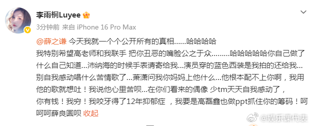 李雨桐喊话薛之谦李雨桐 君子报仇十年不晚 上古真神来了!李雨桐发文喊话薛之谦,“今天我就一个个公开所有的真相”,还在评论区回复网友:“”