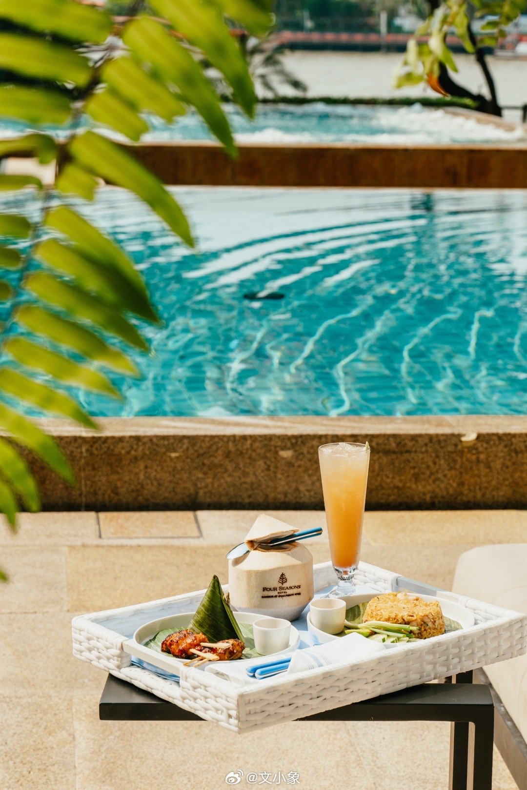 🌊【池畔午餐】这家四季有很漂亮的泳池对着湄南河,池畔也有简餐和饮品可以点单,我们点了黑虎虾沙拉、打抛饭、烤鸡翅啥的,都好好吃,但不太推荐泳池这边的鸡尾酒,也可能我不会点,反正其他饮品都很好,就鸡尾酒有点踩雷。鸡尾酒请移步酒店大名鼎鼎的酒吧享用!