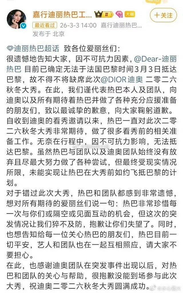 迪丽热巴将缺席时装周我没听错吧?热巴竟然在迪拜???好像是工作人员直飞已到达巴黎,给热巴买的票是中转票现在热巴被滞留迪拜了,太荒唐了!!!希望热巴平平安安的回国啊