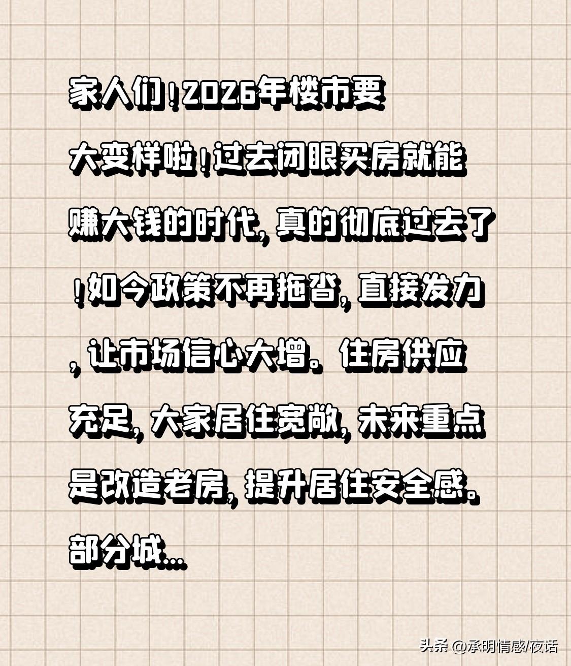 家人们!2026年楼市要大变样啦!过去闭眼买房就能赚大钱的时代,真的彻底过去了! 如今政策不再拖沓,直接发力,让市场信心大增。住房供应充足,大家居住宽敞,未来重点是改造老房,提升居住安全感。部分城市房价已企稳,不再持续下跌。 以后买房得看重品质,别再炒房啦!你觉得自家房子后续涨跌如何?评论区交流,觉得有用就点赞收藏! 房价要回暖 未来买房趋势 楼市实情 全国楼市走势