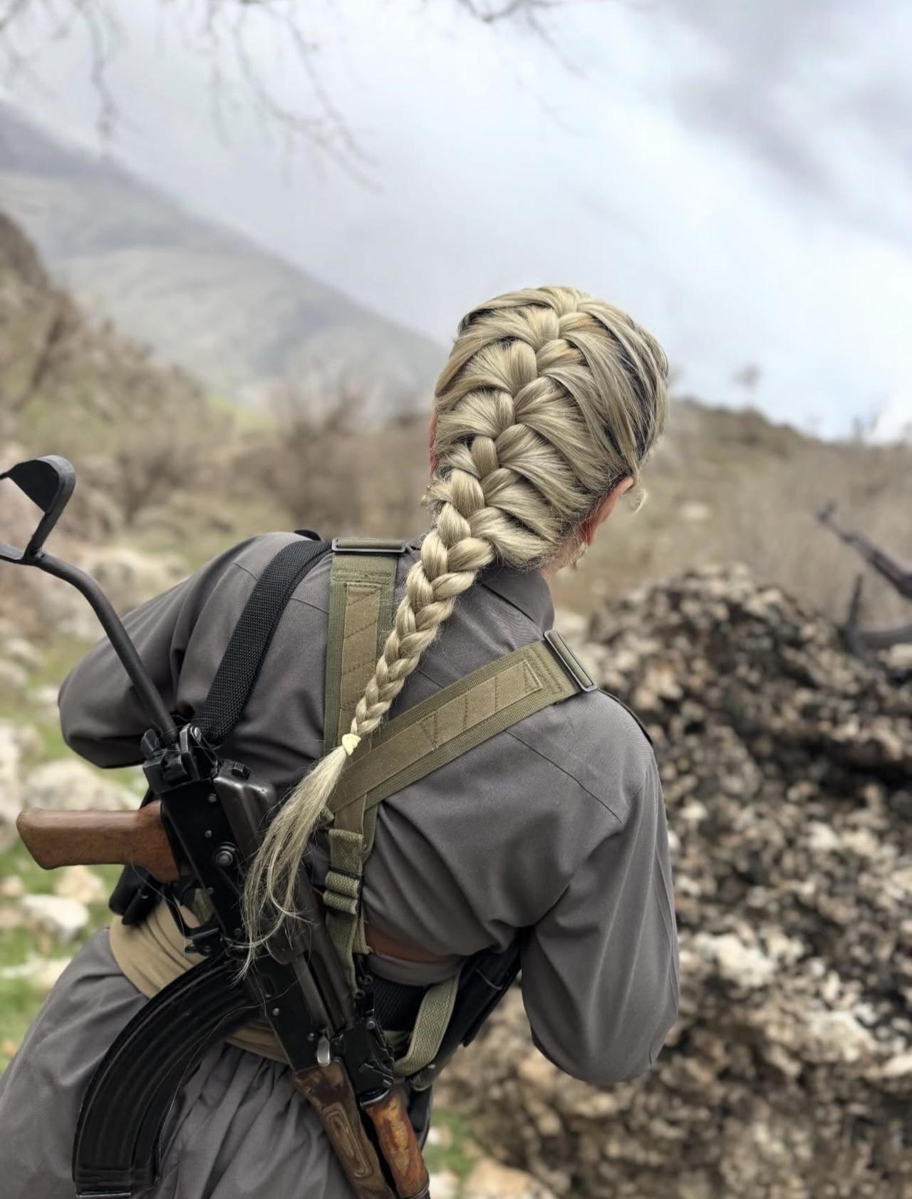 两张库马拉党女战士在伊朗库尔德斯坦山区的照片,一张照片展现了她们在装备齐全的营地中编辫子的亲密场景,另一张照片则是一位梳着辫子的金发女战士独自持枪,象征着女性长期参与该组织的武装抵抗。 库马拉党成立于1969年,是一个信奉马克思列宁主义的库尔德组织,长期以来一直组织库尔德武装对抗伊朗政权。据历史记载,女性战士占比高达30%,这体现了其社会主义意识形态中对性别平等的重视。 该正值2026年3月局势升级之时——包括伊朗对伊拉克库尔德基地的袭击以及库马拉党3月1日呼吁军队成员叛逃——这表明该组织已做好动员准备,这与美国和以色列在伊朗西部的军事行动以及外界对库尔德人可能发动进攻的猜测不谋而合。