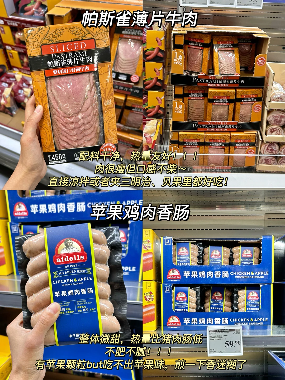 帕斯雀牛肉片、苹果鸡肉香肠、澳洲谷饲板腱牛排、海鲜寿司拼盘