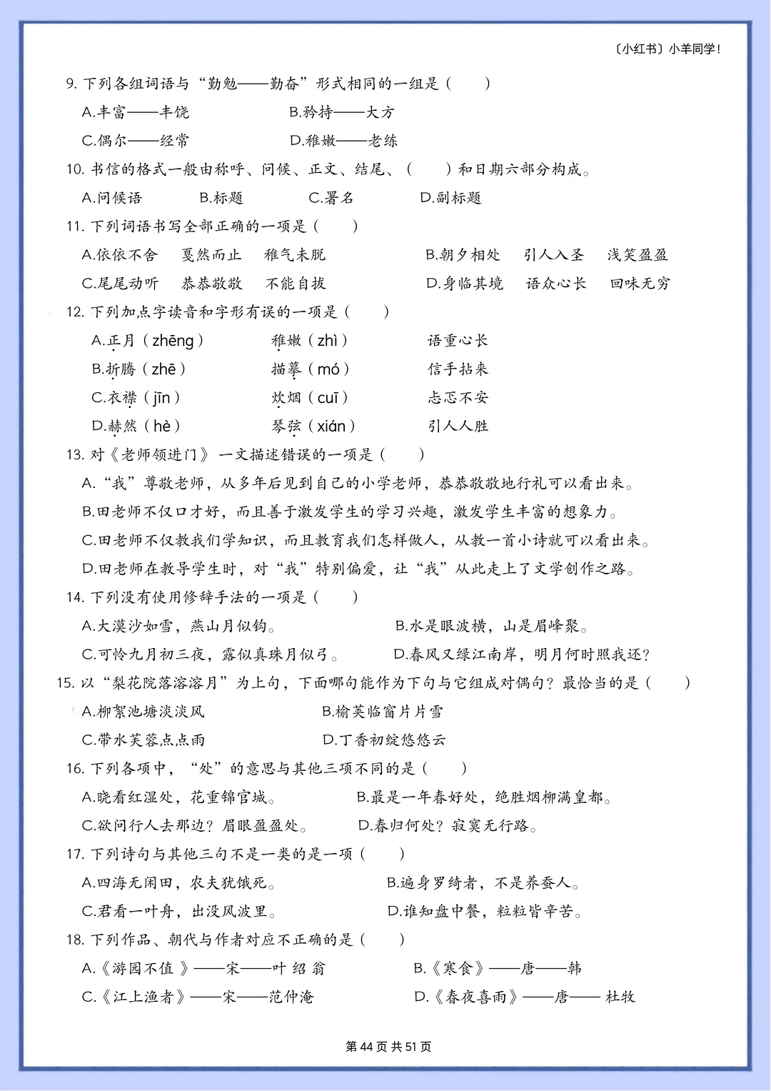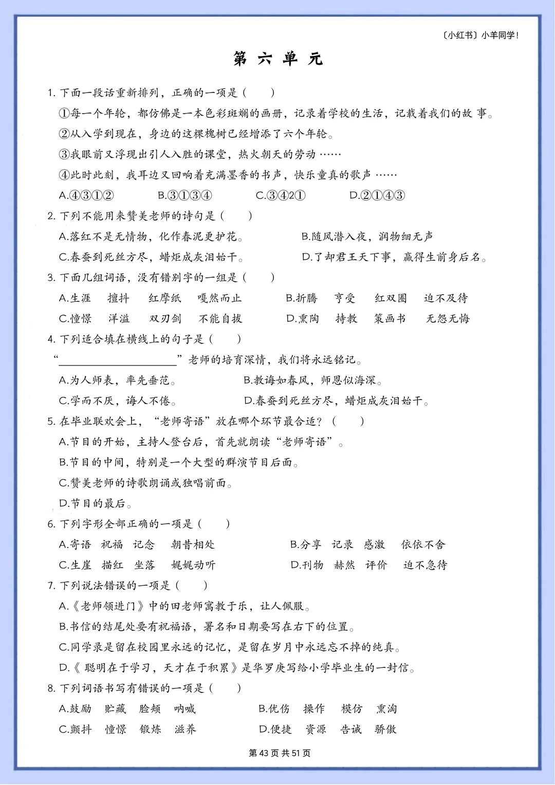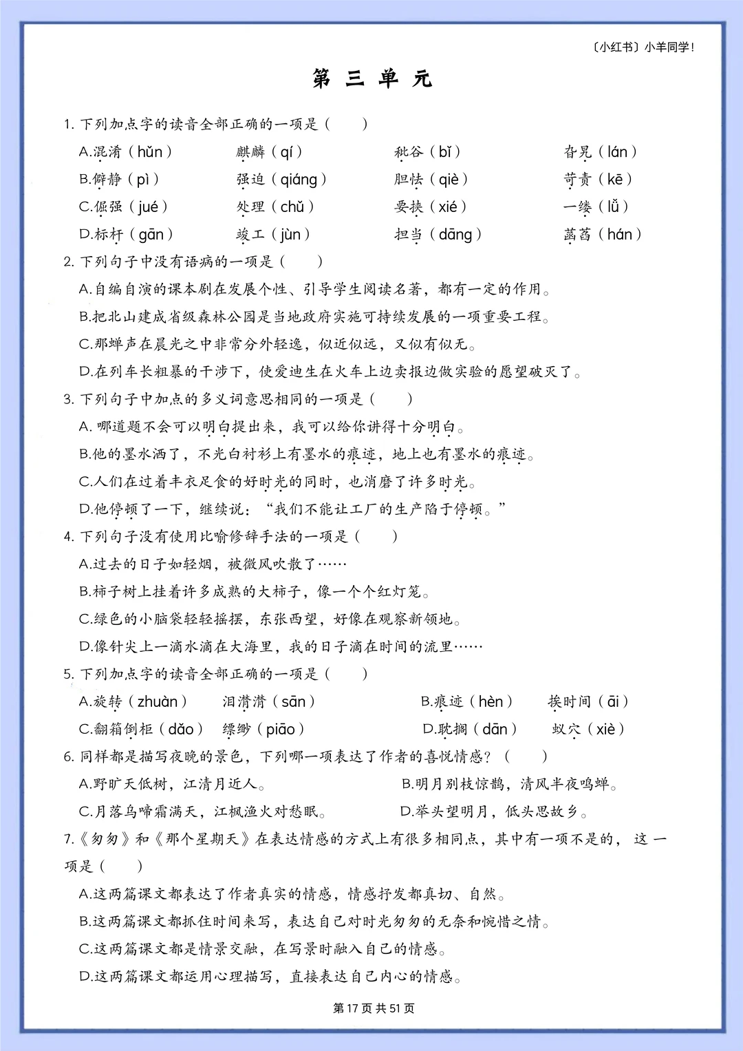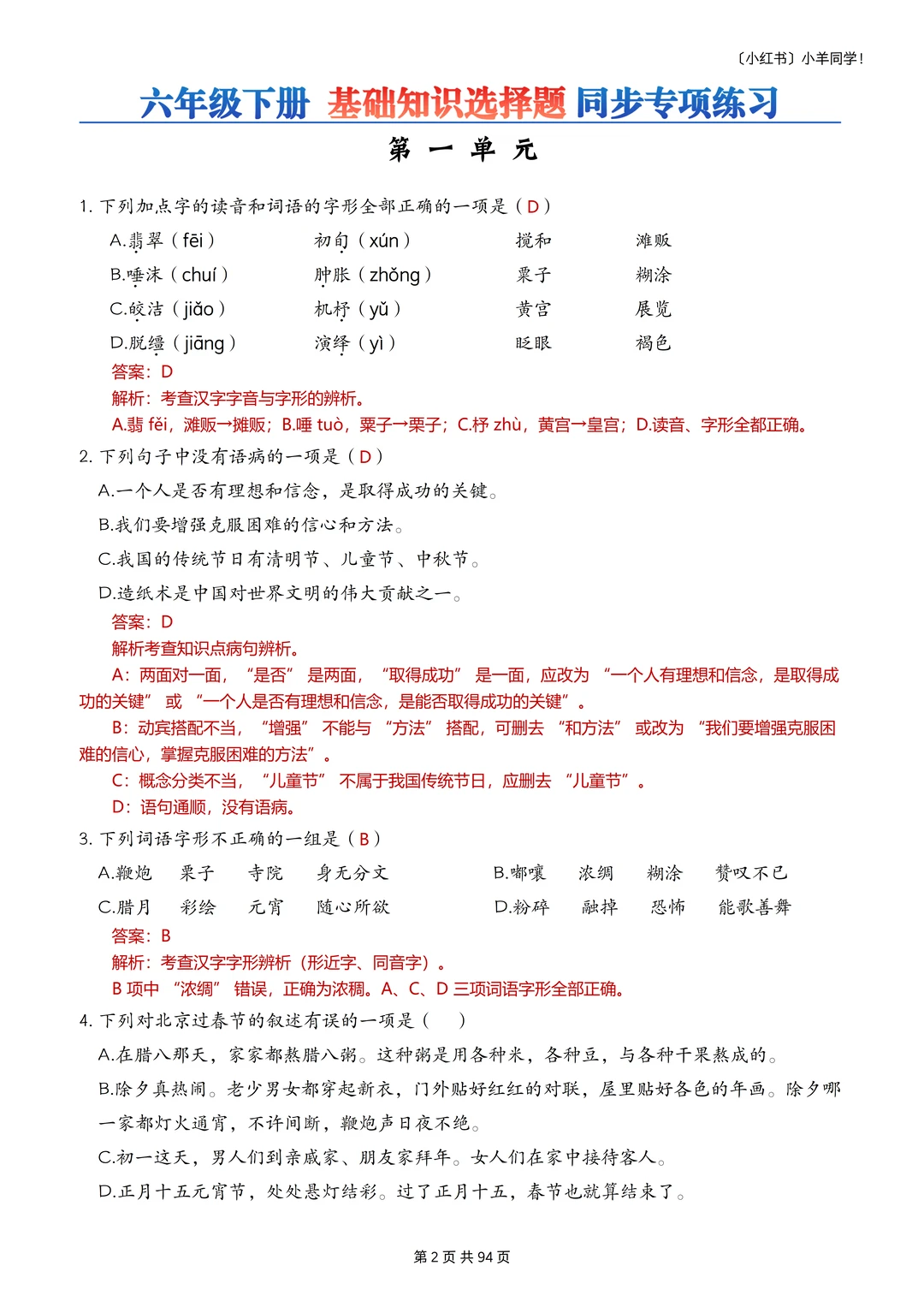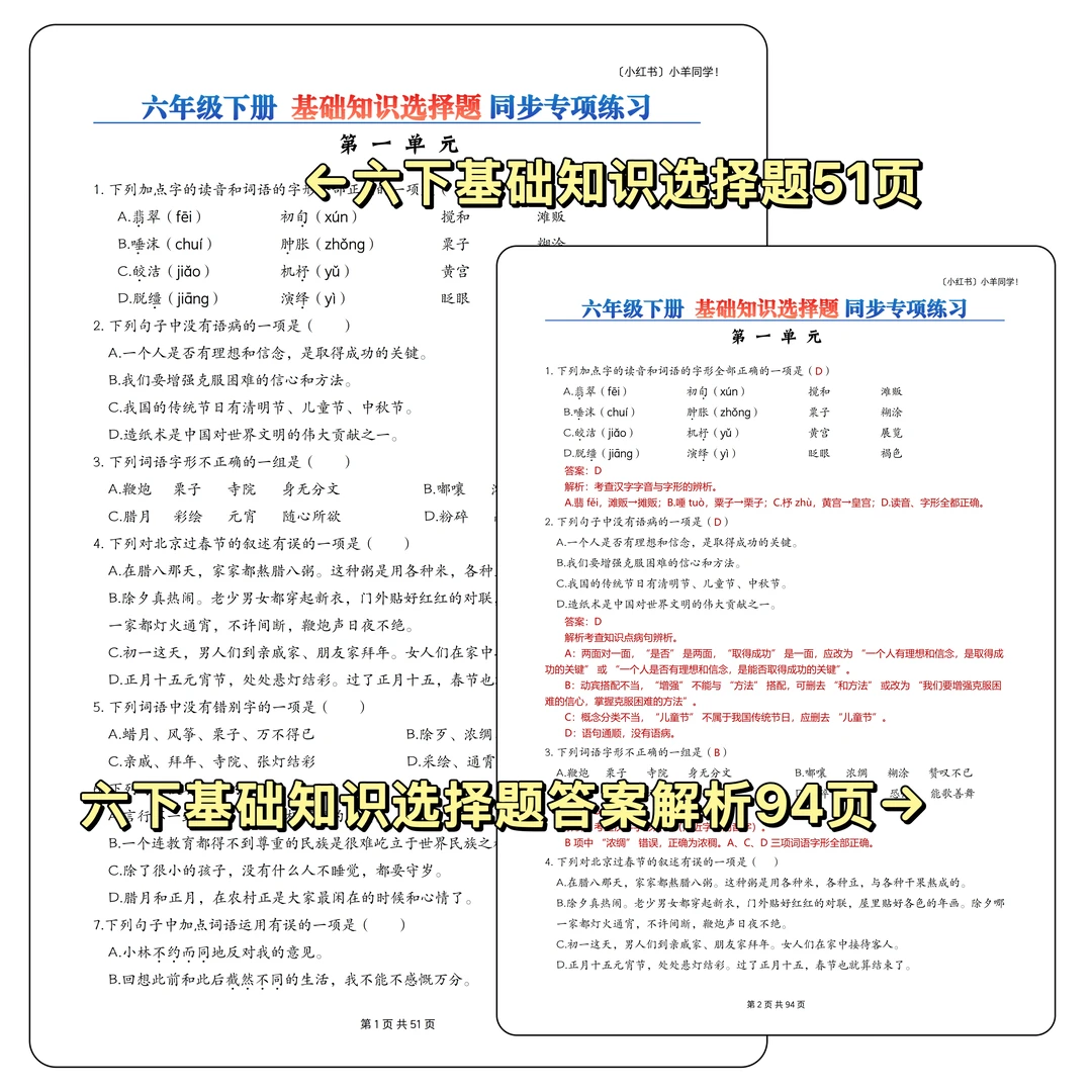 语文题真的是特别枯燥,需要书写的特别多,小朋友很抵触,很多时候都是大量重复的写写写,消耗孩子对语文的热情。 而这套题真的很适合小朋友,小朋友也非常愿意做,尤其是基础不好的小朋友,这套题非常推荐。因为全部是选择题,不需要写很多的字,但是考察的知识面真的非常非常多!! 比如: 辨析字音,短语类型,修辞手法,课文理解, 词语归类,汉字读音,词语搭配,多音字, 字词解释,病句改正,理解句子,语境理解, 课外阅读,句子排序,汉字字形,解释字义, …… 真的特别特别多的知识点。非常推荐这套题。 [玫瑰R] 内容: 六年级下册一共六个单元,每单元大约55道左右。 其中试题51页,答案94页。 答案解析非常详细。 ⚠️原创整理,禁止转载发布网络平台或商用,违者必究。