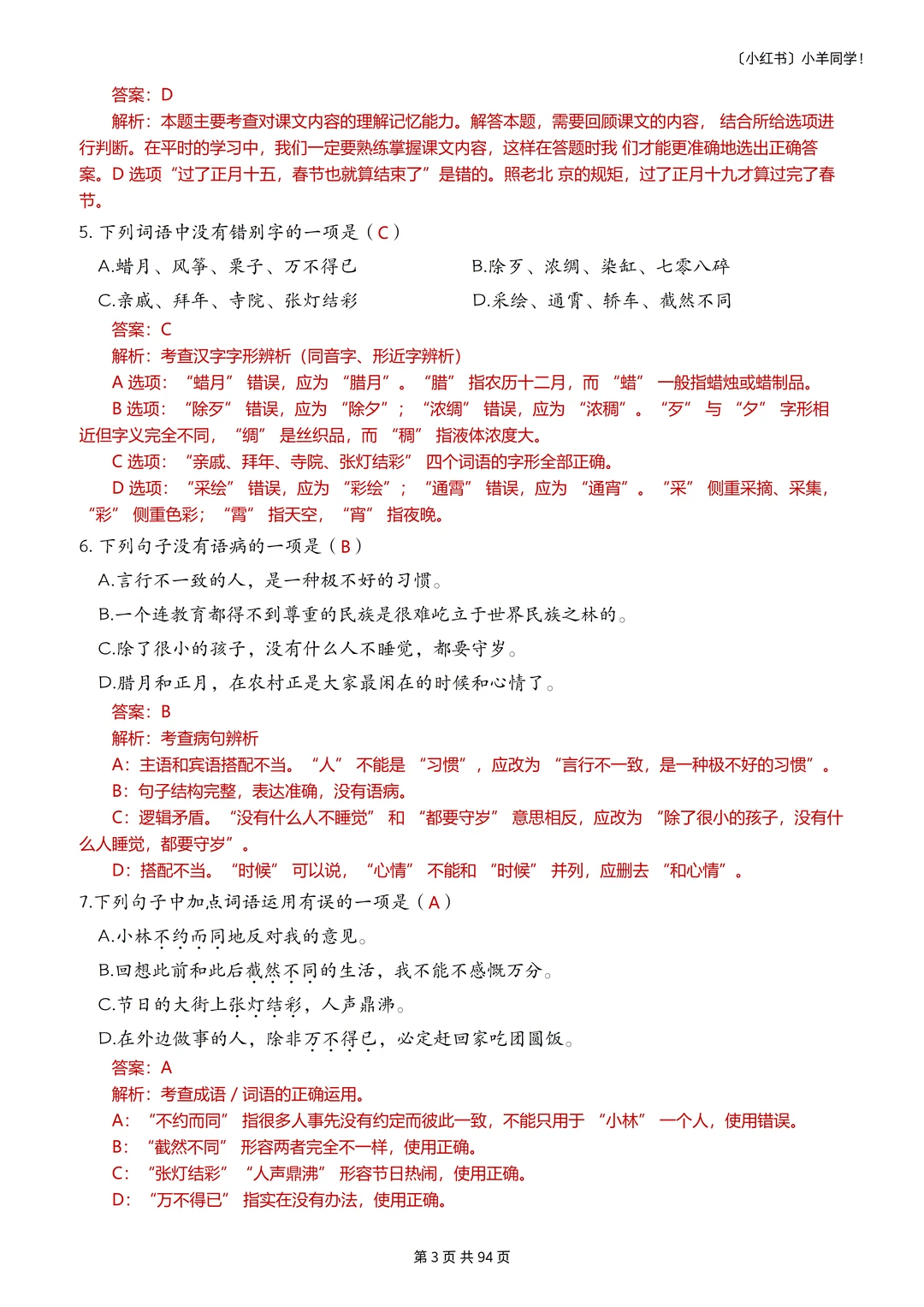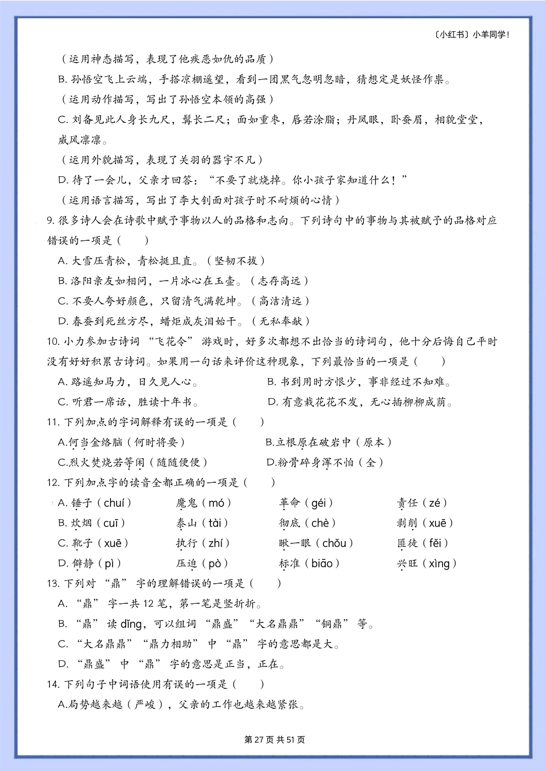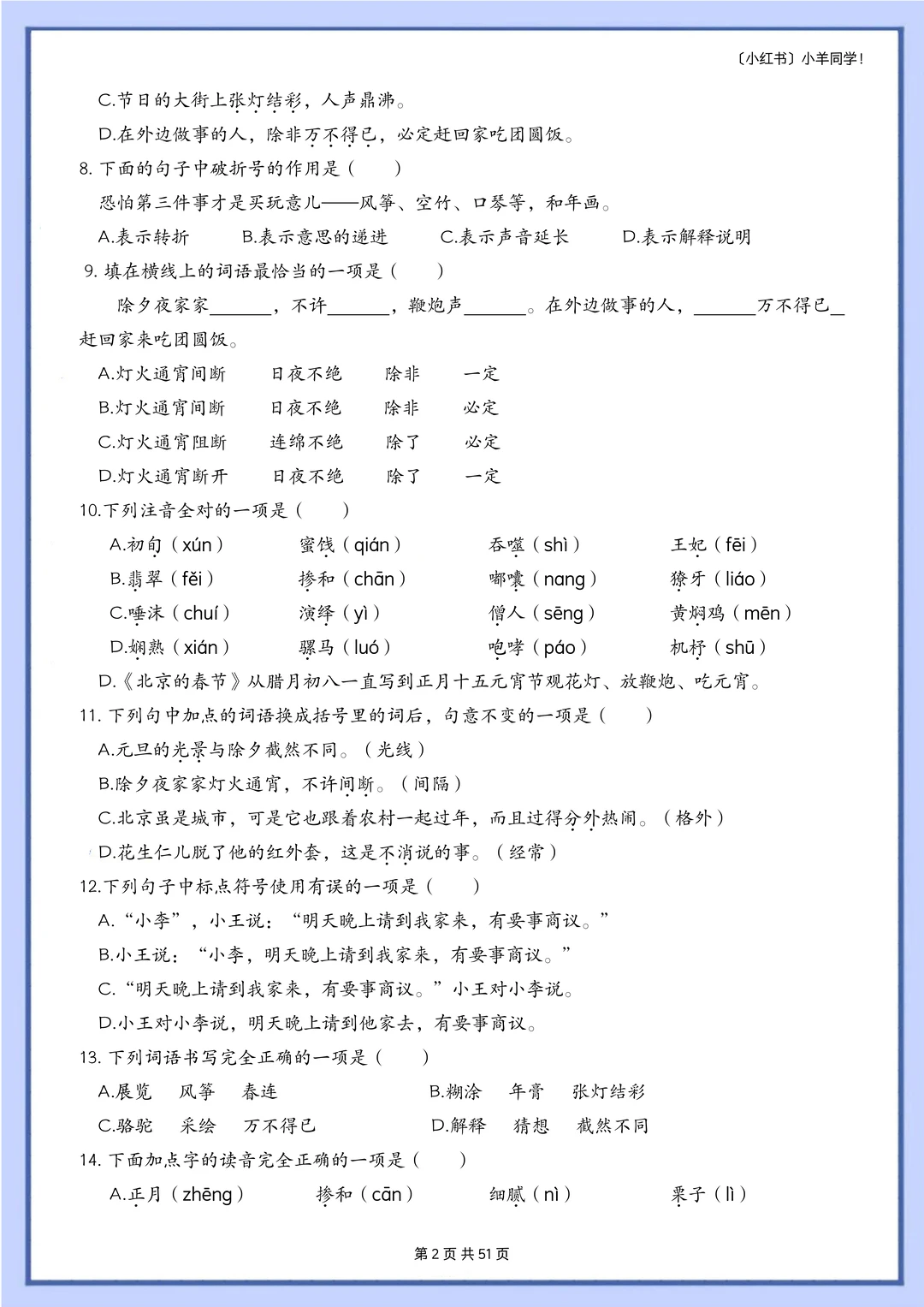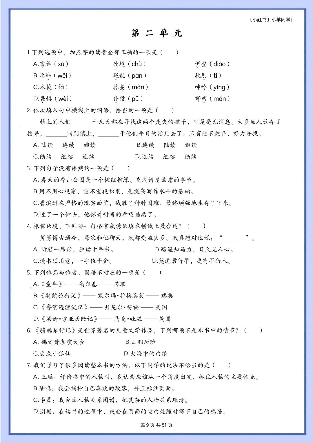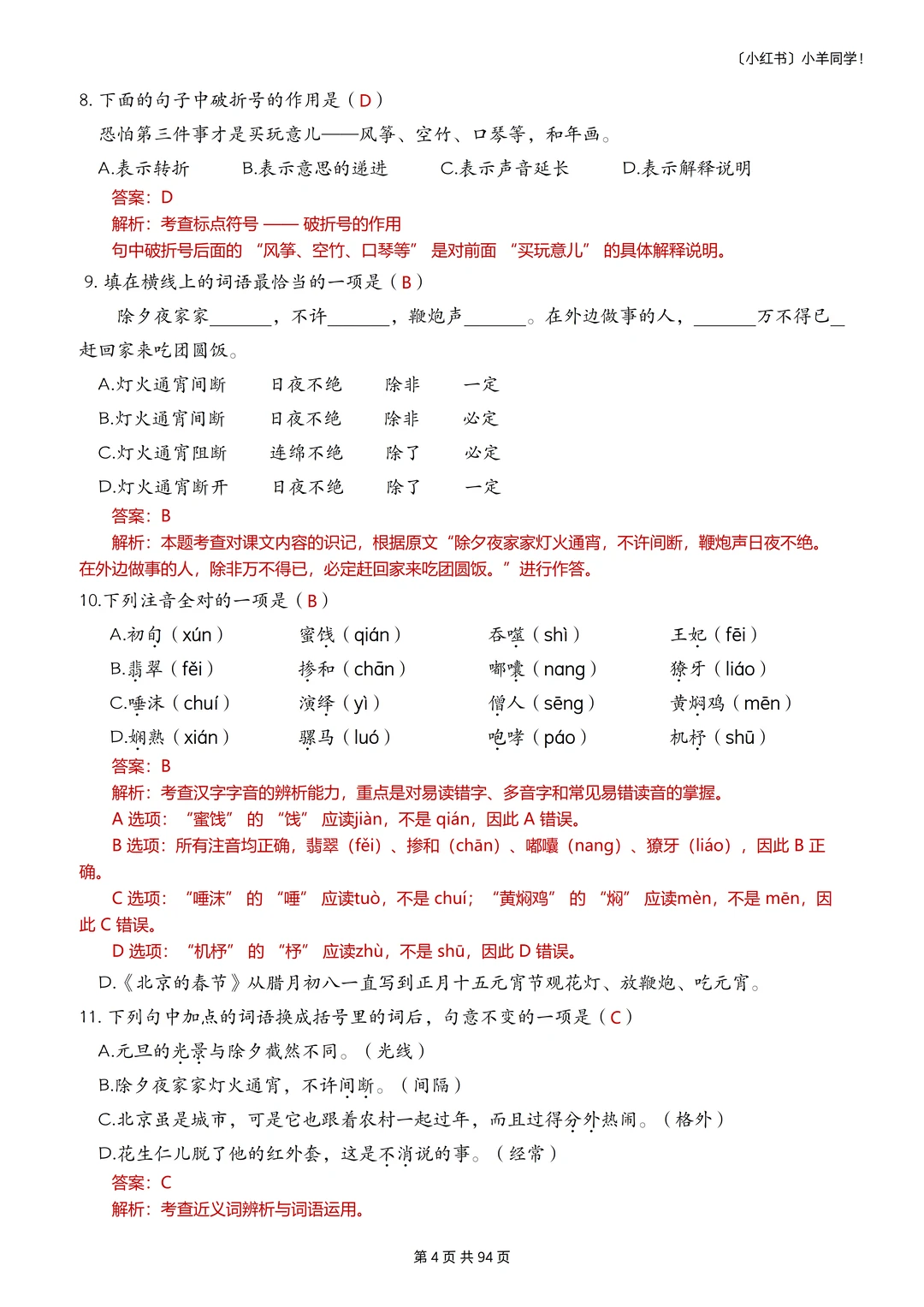 语文题真的是特别枯燥,需要书写的特别多,小朋友很抵触,很多时候都是大量重复的写写写,消耗孩子对语文的热情。 而这套题真的很适合小朋友,小朋友也非常愿意做,尤其是基础不好的小朋友,这套题非常推荐。因为全部是选择题,不需要写很多的字,但是考察的知识面真的非常非常多!! 比如: 辨析字音,短语类型,修辞手法,课文理解, 词语归类,汉字读音,词语搭配,多音字, 字词解释,病句改正,理解句子,语境理解, 课外阅读,句子排序,汉字字形,解释字义, …… 真的特别特别多的知识点。非常推荐这套题。 [玫瑰R] 内容: 六年级下册一共六个单元,每单元大约55道左右。 其中试题51页,答案94页。 答案解析非常详细。 ⚠️原创整理,禁止转载发布网络平台或商用,违者必究。