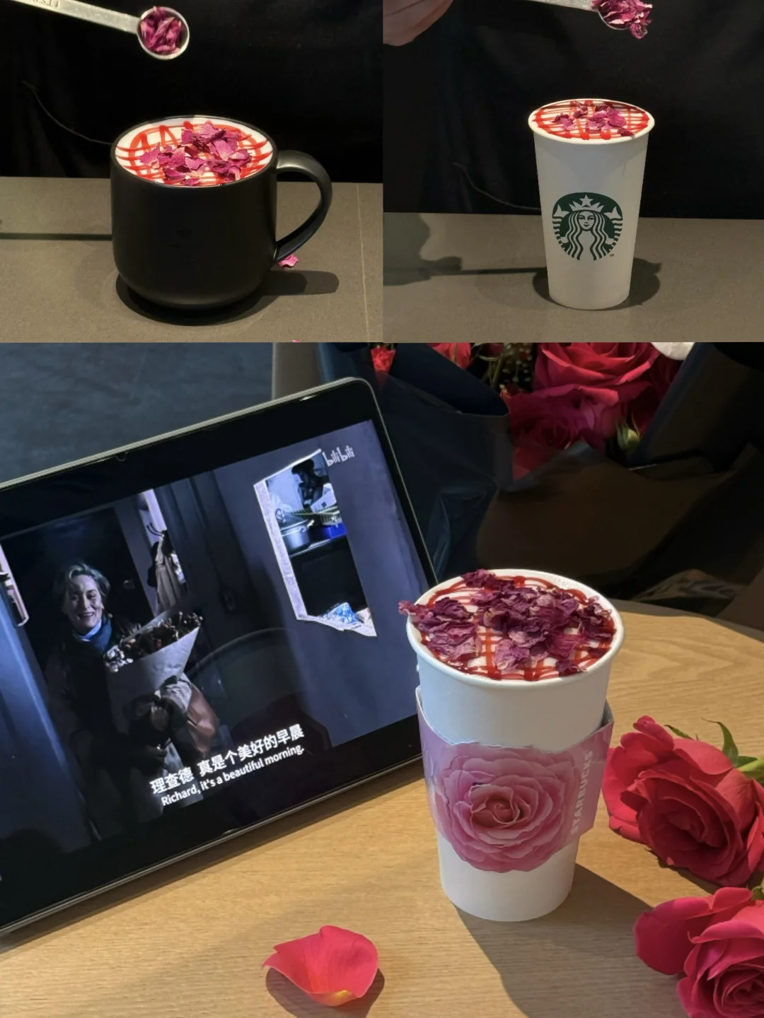 最爱的玫瑰20玛奇朵,绵密的奶泡上漂着真实的玫瑰花瓣,轻轻搅动,花瓣在杯中旋转。喝到最后一口,舌尖还能碰到软软的花瓣,带着淡淡的甜。
