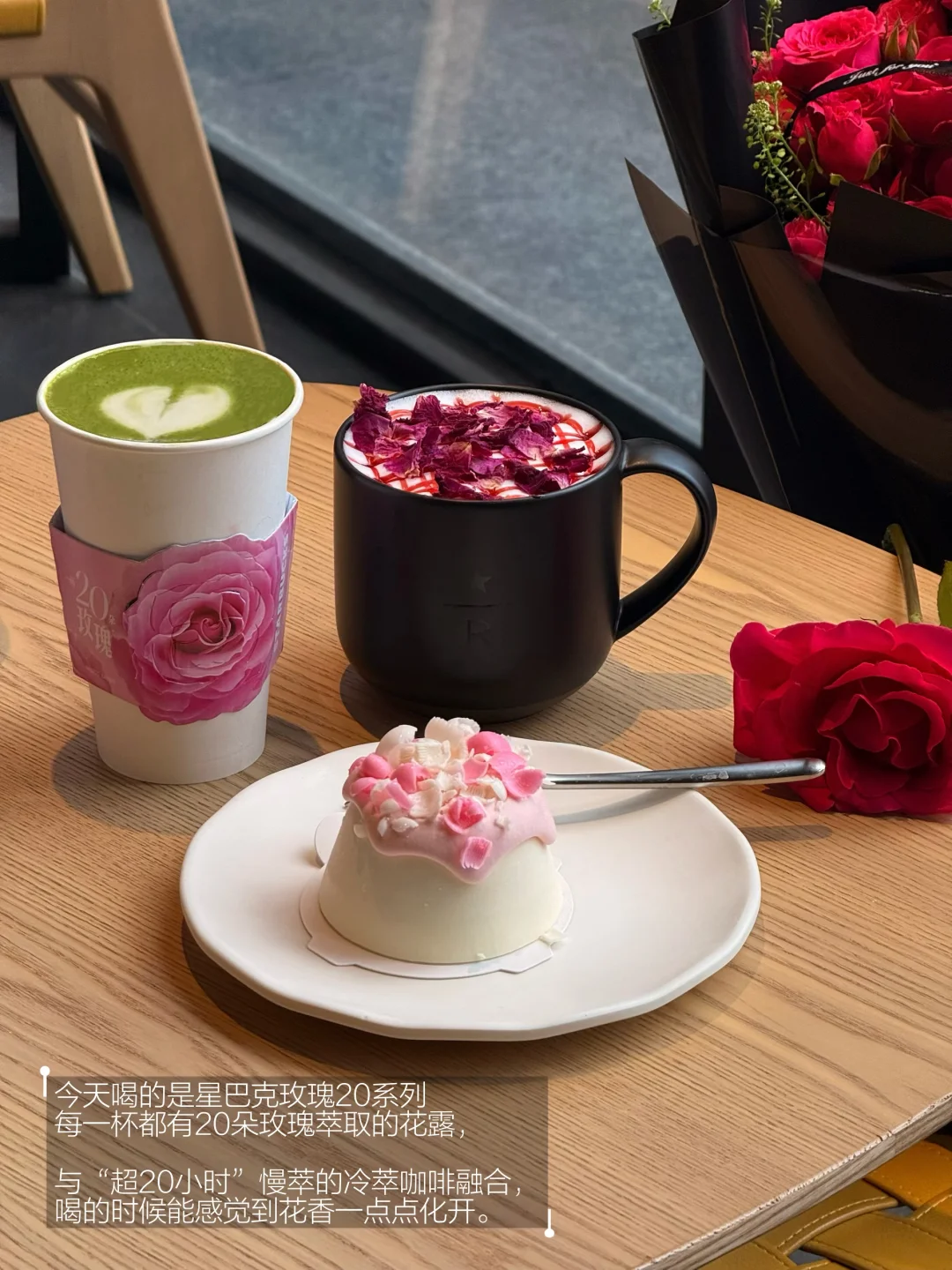玫瑰20抹茶拿铁用的是超千目研磨的一级抹茶,抹茶的清香先涌上来,后味慢慢浮现出玫瑰的甜,层次感很妙。