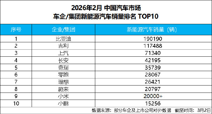 2026 年开局,中国新能源汽车市场格局进一步清晰。比亚迪 2 月新能源汽车销量 190190 辆,稳居行业首位,自 2021 年 6 月起已连续 57 个月领跑国内新能源市场,销售淡季表现依然稳健。公司新能源汽车累计销量已突破 1550 万辆,规模优势持续扩大。受春节影响国内消费节奏放缓,比亚迪海外板块高增长,2 月海外销量 100151 辆,同比增 41.4%;1-2 月累计海外销售 200160 辆,同比增 42.3%,全球布局加速兑现。高端品牌矩阵向上突破,方程豹、腾势、仰望 2 月合计销量 2.3 万辆。此外,比亚迪宣布 3 月 5 日举办颠覆性技术发布会,获资本市场积极认可。依托规模、技术与全球市场三重优势,比亚迪稳步前行。