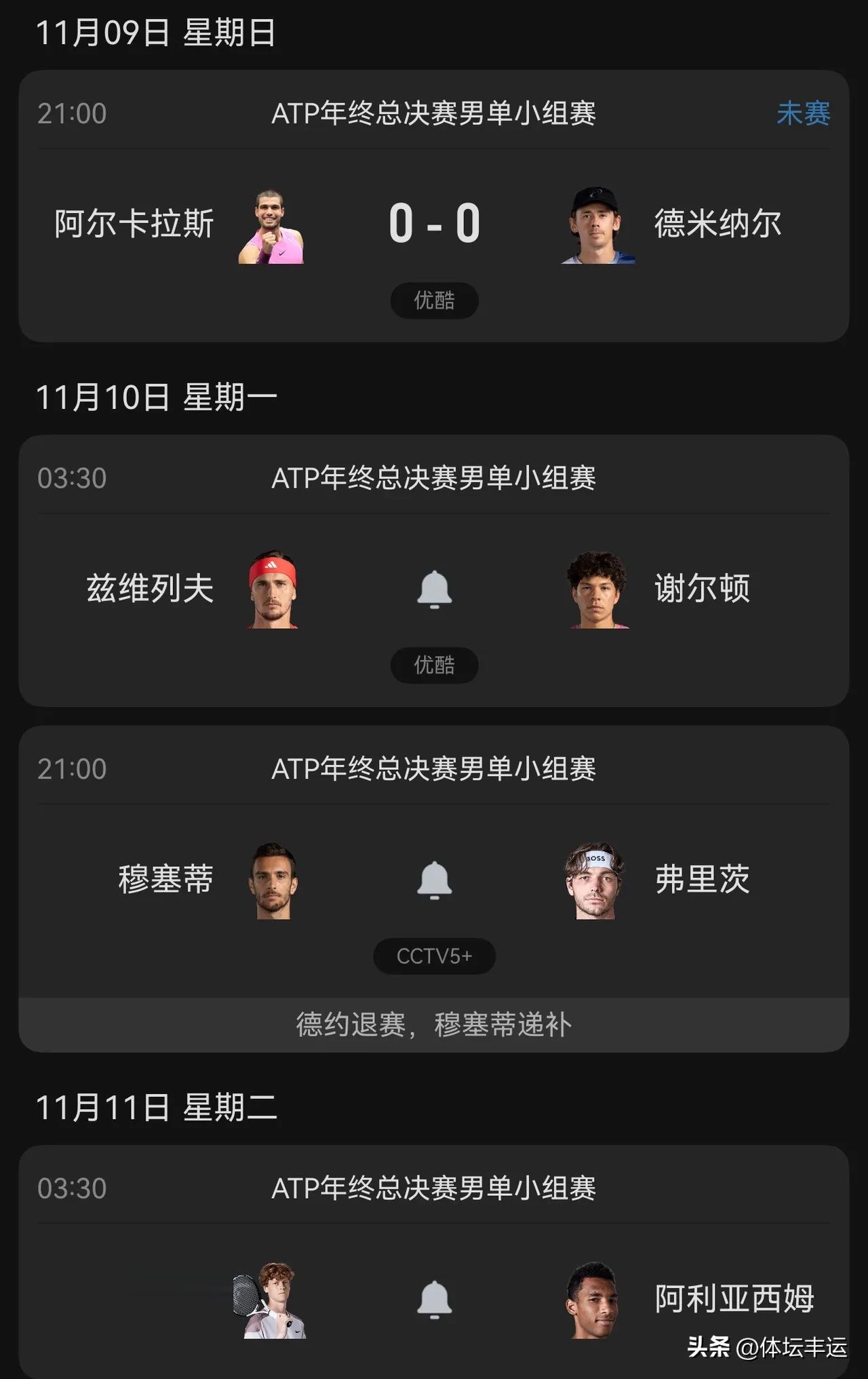 意大利都灵ATP年终总决赛小组赛第一场比赛,1号种子西班牙阿尔卡拉斯vs7号种子澳大利亚德米纳尔!首盘,