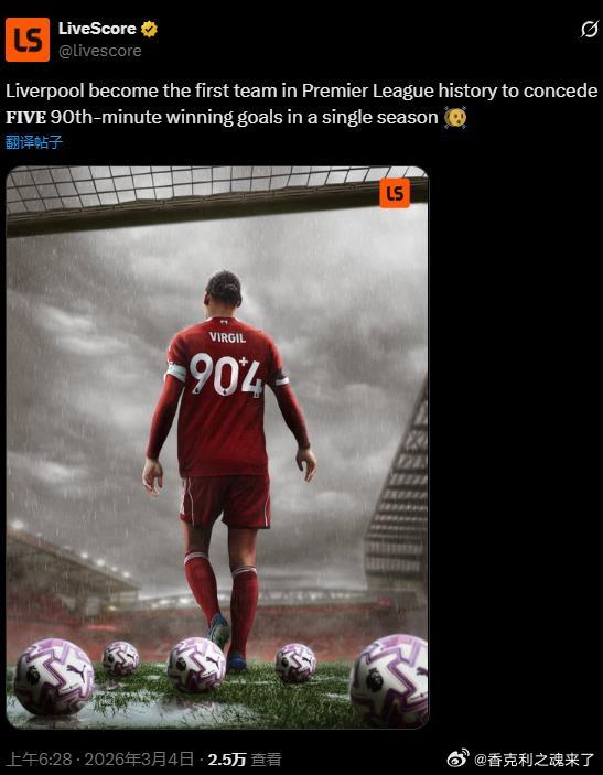利物浦成为英超历史上首支单赛季在90分钟被五次打进绝杀进球的球队