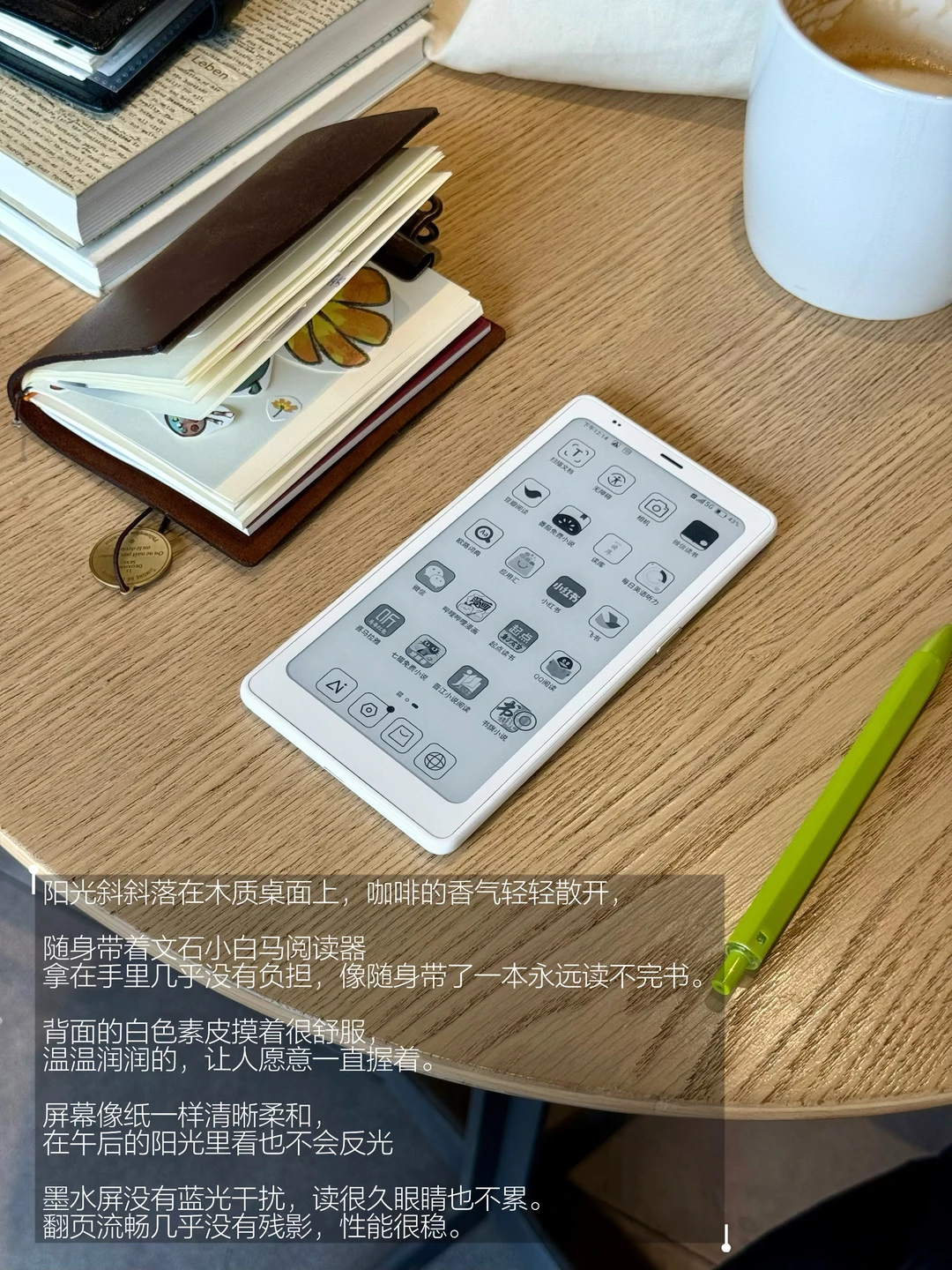 随身带着文石小白马阅读器,拿在手里几乎没有负担,像随身带了一本永远读不完的书。背面的白色素皮摸着很舒服,温温润润的,让人愿意一直握着。