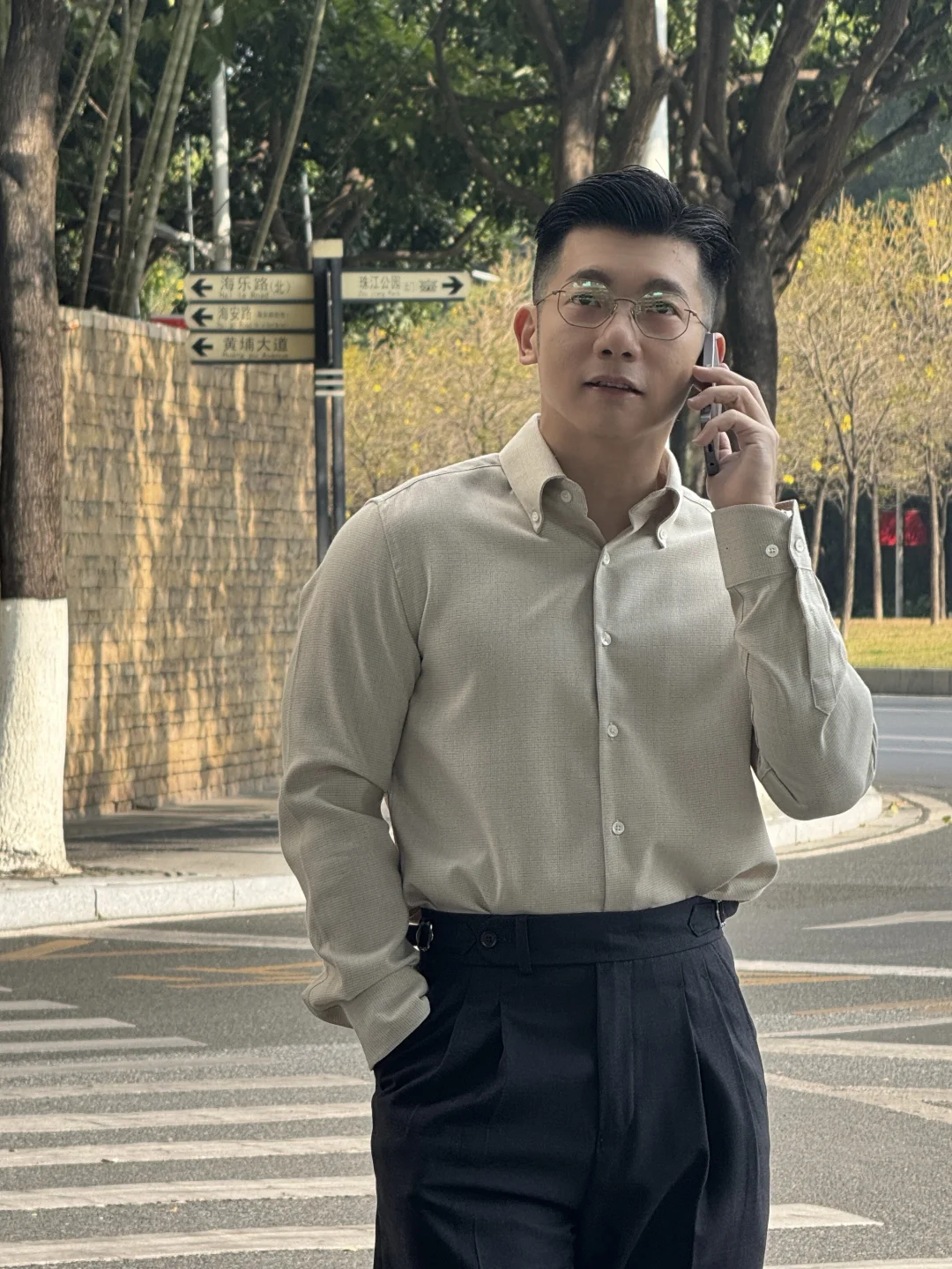 它不是那种寡淡的纯白色,而是带着温暖底调的米色。上身效果真的绝了,自带一种沉静、儒雅的书卷气,就像是从老电影里走出来的知识分子,有种不自知的帅气。