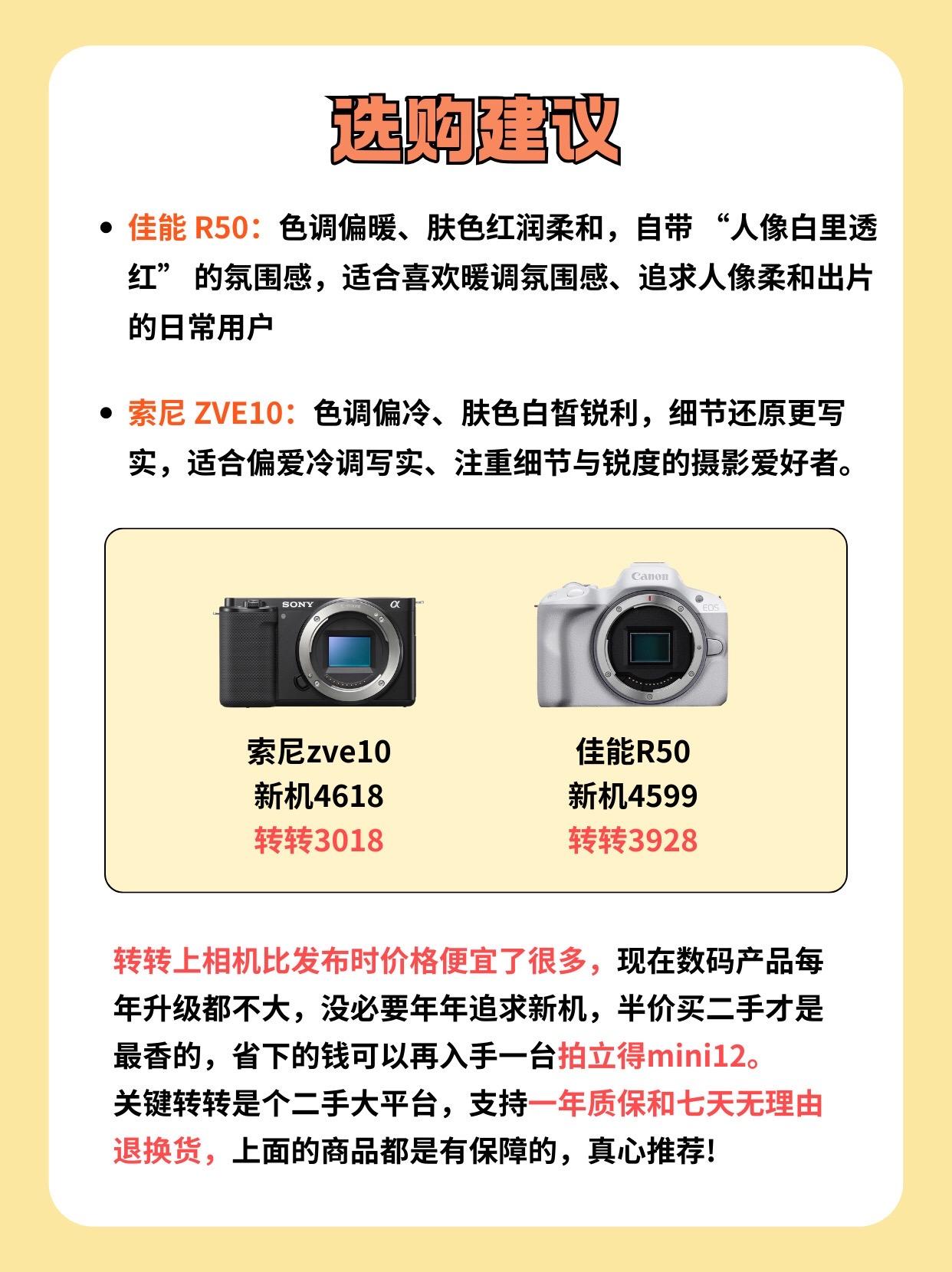 最热门的两款相机拍照对比。佳能 R50:色调偏暖、肤色红润柔和,自带 “人像白里透红” 的氛围感,适合喜欢暖调氛围感、追求人像柔和出片的日常用户