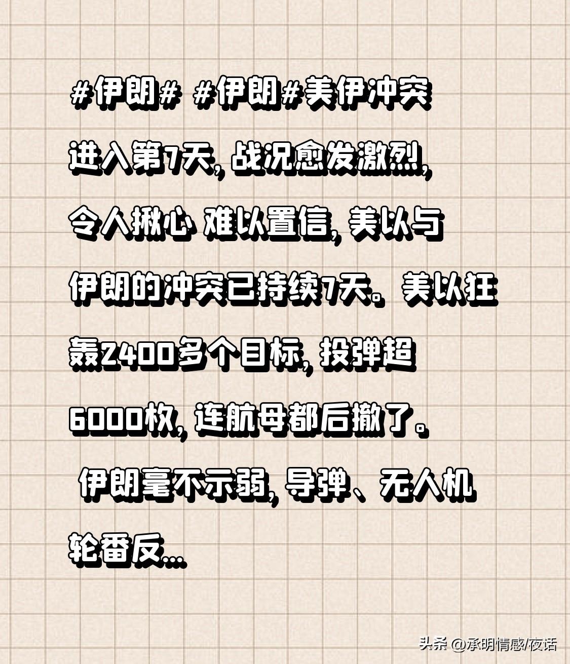 美伊冲突进入第7天,战况愈发激烈,令人揪心 难以置信,美以与伊朗的冲突已持续7天。美以狂轰2400多个目标,投弹超6000枚,连航母都后撤了。 伊朗毫不示弱,导弹、无人机轮番反击,还封锁海峡,局势完全失控。 双方皆有伤亡,互不相让,这场仗不知何时能结束! 揪心的朋友点个赞,留言分享你的看法~