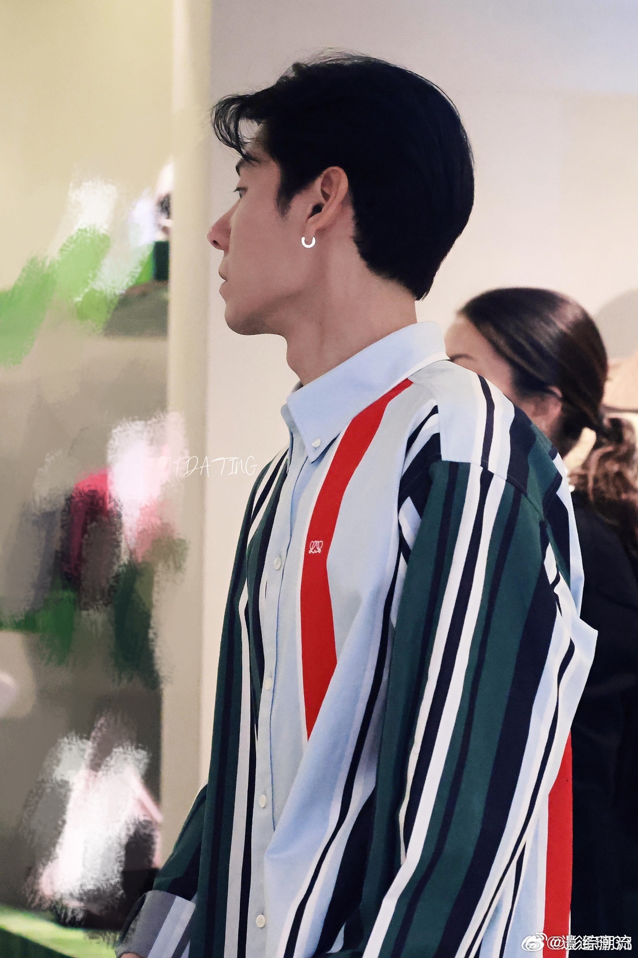 蒋奇明突然闯入镜头 每一次街头回眸都像电影画面,彩色条纹衬衫随意松弛,硬朗轮廓与