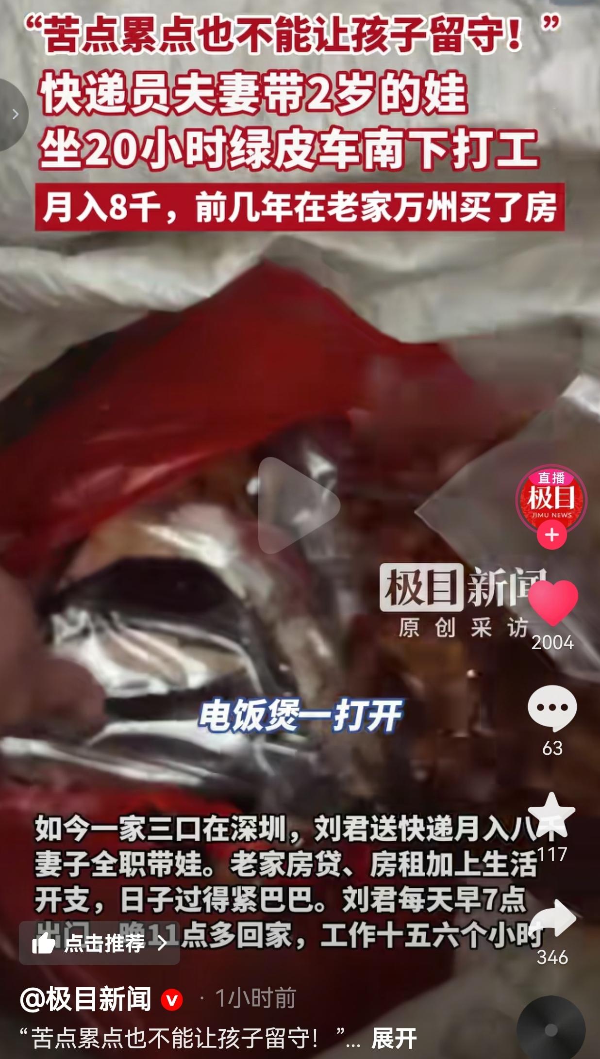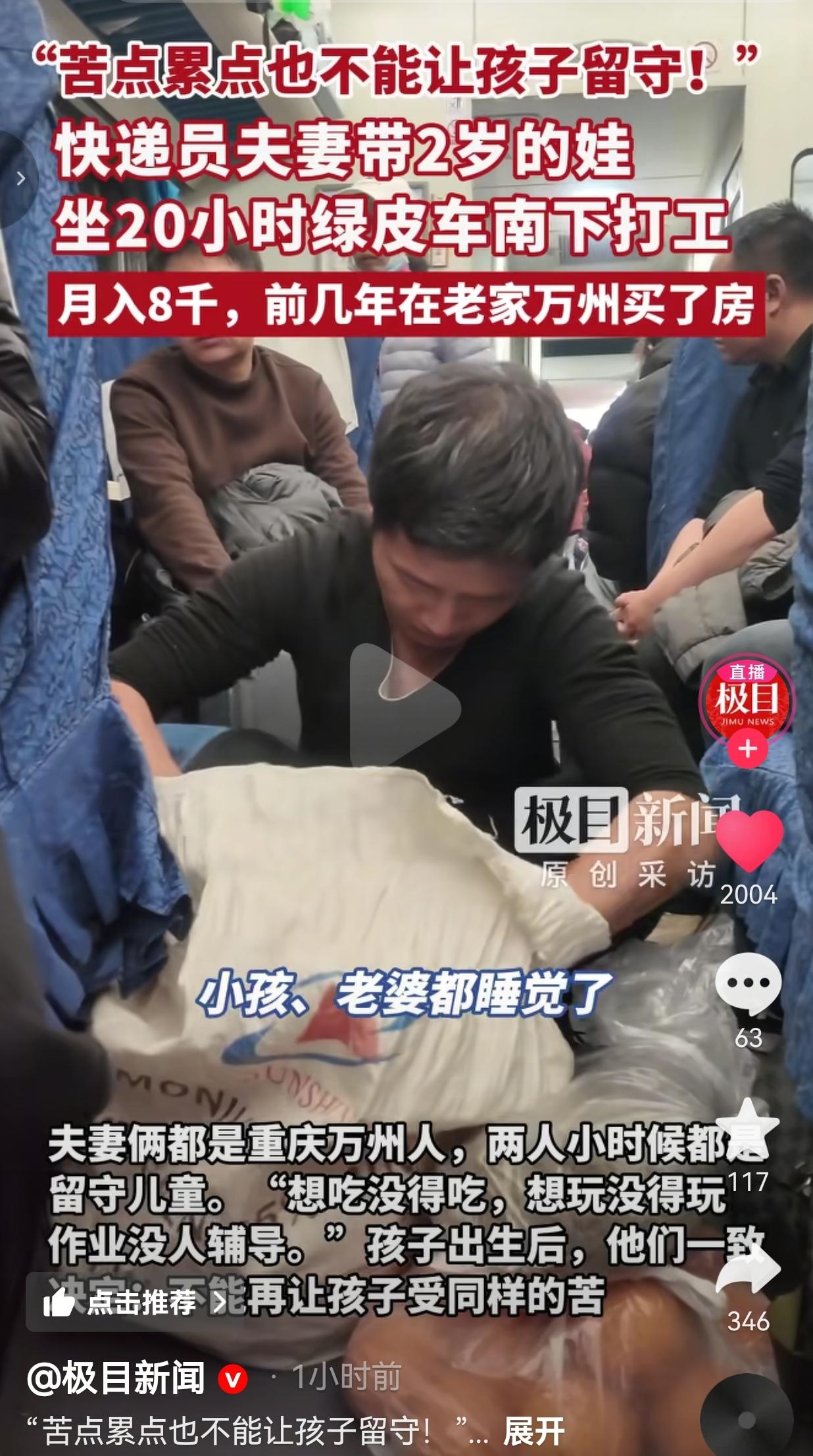 看哭了!一列绿皮火车,20个小时的颠簸路程,一对年轻的快递夫妻,怀里还抱着个才2岁的娃。他们背着鼓鼓囊囊的行囊,座位下塞满了腊肉、香肠这些家乡特产,就这么一路南下,奔赴打工的日子。 先跟大家唠唠这对夫妻的情况,33岁的快递员刘君和妻子都是重庆万州人,夫妻俩小时候都是留守儿童。他们太懂那种“想吃没得吃,想玩没得玩,作业没人辅导”的滋味了,所以孩子出生后,俩人一拍大腿:苦点累点,绝不能让孩子走自己的老路! 为了把孩子带在身边,他们放弃了让孩子留守老家的“轻松”,选择带着娃一起闯。 刘君每天早上7点就扎进工作里,一直忙到晚上11点多才回家,一天干十五六个小时,每周就休一天,月入8千,在深圳这个大城市,还要扛着老家房贷、房租和一家人的生活开支,日子过得紧巴巴的。 即便如此,他依旧坚强面对生活,他说“老婆孩子在身边,没什么苦的”。 网友看到后评论说:“看得我眼泪汪汪的。我也是从老家带娃在外地打工,每天早上六点出门,晚上八点回家,累得话都不想说,但只要看到娃扑过来抱我,就觉得一切都值了。带在身边虽然累,但心里是踏实的啊!” 还有的网友说:“这对夫妻太伟大了。我老公总说等我赚大钱了让孩子回老家享福,我就怼他,你赚大钱是为了啥?不就是为了家人过得好吗?如果家里冷冰冰的,有啥意思?” 我就在想啊,咱们总说“为了生活奔波”,可奔波的意义到底是什么?是为了赚更多的钱,住更大的房子? 可这对夫妻告诉我们,钱固然重要,但一家人整整齐齐、孩子在身边,才是奔波最核心的底气。 咱们身边太多这样的例子了,父母在外打工,把孩子留给老人,一年到头见不了几面。 老人能给孩子温饱,能看着孩子长大,可给不了父母的陪伴和细致的关爱。 孩子慢慢长大,跟父母没话说,亲子关系变得生分,甚至有些孩子因为缺乏管教,走上歪路,到时候赚再多的钱,又有什么用呢? 这对夫妻也不容易,每天高强度工作,背着生活的重担,可他们宁愿自己多吃苦,也要守住孩子的童年。 他们没有什么惊天动地的誓言,就只是用最笨、最实在的方式,践行着“不让孩子留守”的承诺。 火车上的20个小时,孩子可能会哭闹,会疲惫,可孩子知道,爸爸妈妈就在身边,饿了有热乎的饭吃,累了有温暖的怀抱靠。这种安全感,是任何物质都替代不了的。 他们也有压力,也会觉得辛苦,可他们把苦咽进肚子里,把笑挂在脸上。这份为了孩子拼尽全力的勇气,这份对亲情的珍视,真的太打动人了。 针对此事,你有什么看法呢?欢迎大家评论区讨论留言。