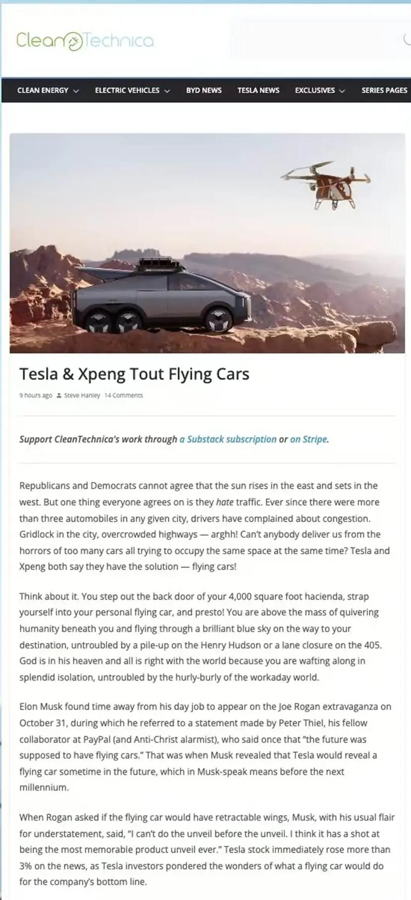 哪怕马斯克大力画饼表示“这可能会成为史上最令人难忘的产品发布”,但连外媒都分得清前后,评价特斯拉推出飞行汽车是“跟随小鹏步伐”。