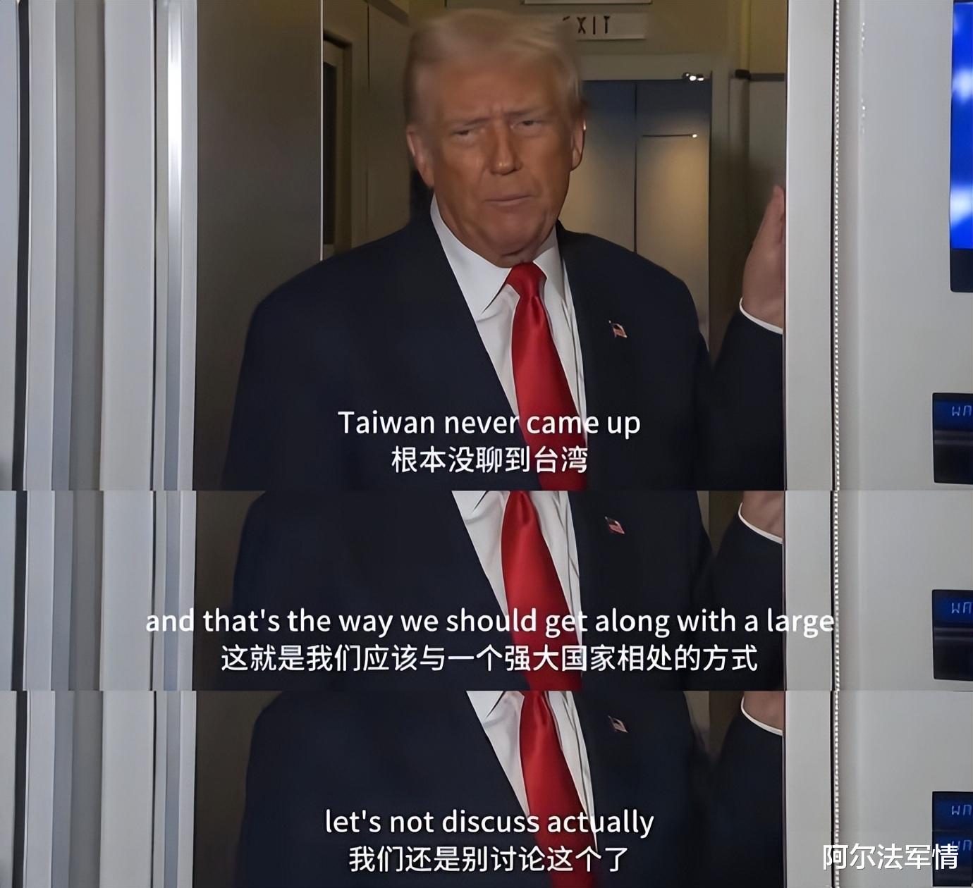 特朗普在从釜山返回美国的飞机上接受了美国记者的采访,非常直白地说,中美双方“根本没聊到台湾”,“这就是我们应该与一个强大国家相处的方式,我们还是别讨论这个了”。