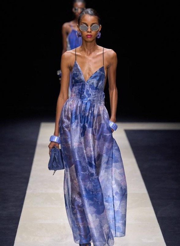 按理说能参加时装周最差也是轻奢品牌吧,她穿上阿玛尼的轻奢线。Emporio Armani2025春夏系列印花裙装穿在身上,咋还有这么土气的网红风格。这是时装周,讲究质感、个性、 自信 、美得千篇一律就泯然众人了。