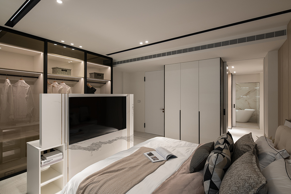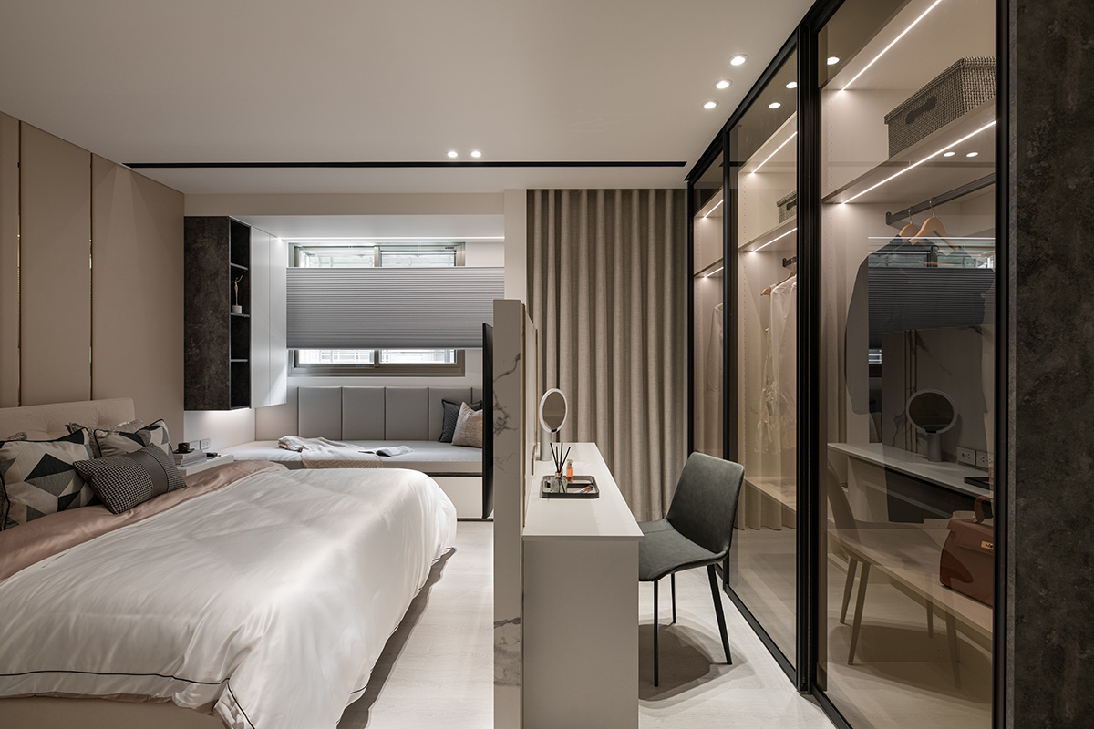 卧眠区划分一座高衣柜,藉由穿透材质的茶玻门片,映透层板的线性灯带,在光漫入之每一时刻,会交错不同角度光跡。