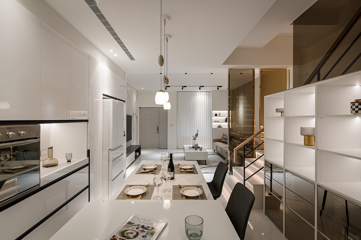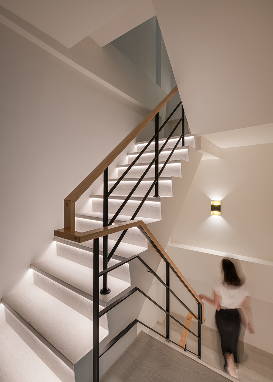 原始楼梯衔接上下,但常造成光影不流通,本案拆除厚重墙面,由地面升起一道轻透茶玻,衬为两域界线,亦筑起展示收纳柜,上方裸现茶玻,下方以茶镜覆为门片,彷彿衬作一座轻盈浮岛,消弭了传统楼梯侧之暗角,放大了场域感。