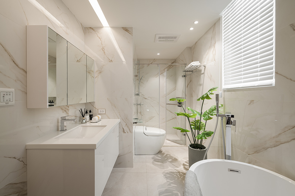 并重新建置储热保温功能的热水器,完善卫浴机能,采用大地色泽纹理的浅系薄板砖,当对外窗光源漫入时,光映在镜柜上,又一次放大空间张力。