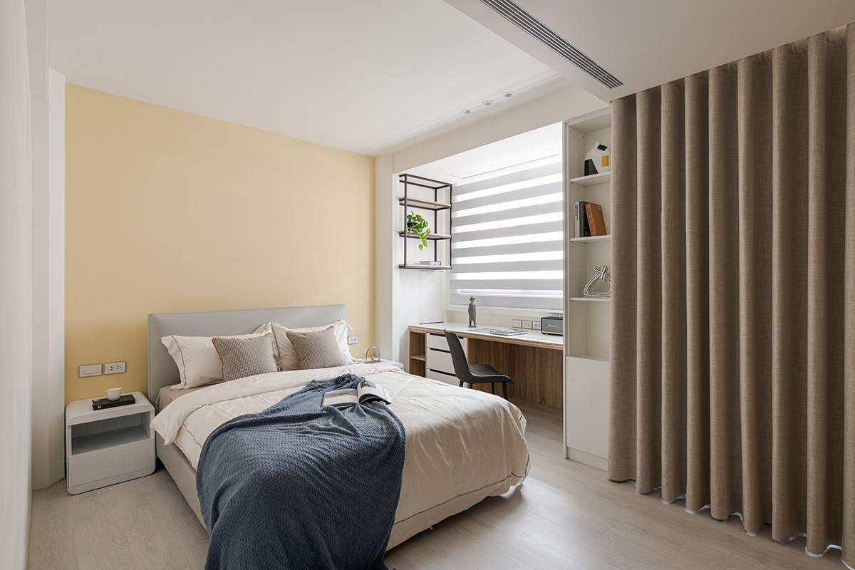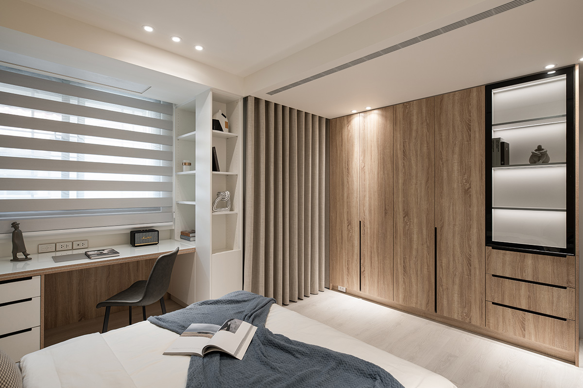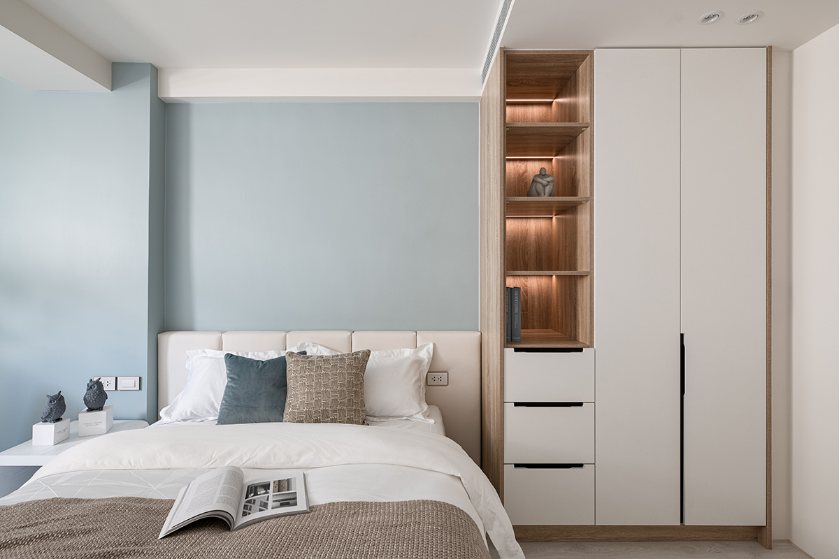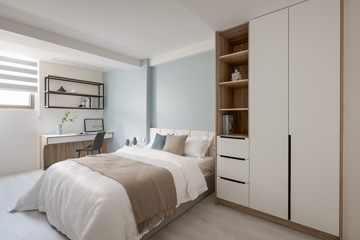 弟弟卧房以清浅天空蓝与白系柜面相映,同样于窗边,形构一域阅读区,上方筑一铁件层板吊柜,因卧房位于楼梯侧,形成畸零区块,正好可开为独立衣柜间,提高储物量。