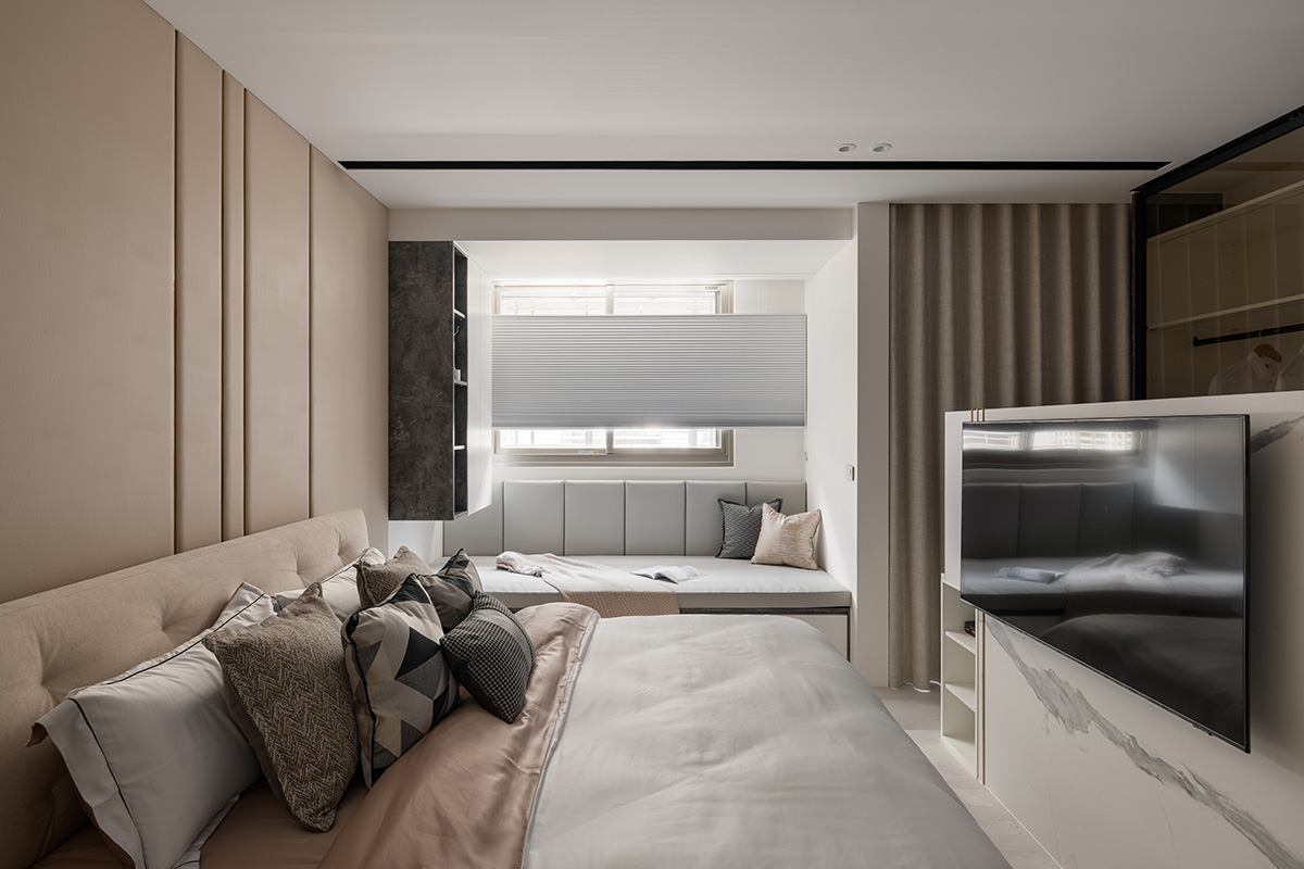 前方保留了一径廊道,筑起 155 公分半高墙体,作为梳妆台,柜内可辅佐备品归整,对侧则引同色系板砖,悬挂电视机,与皮革绷布烘托精品饭店氛围。