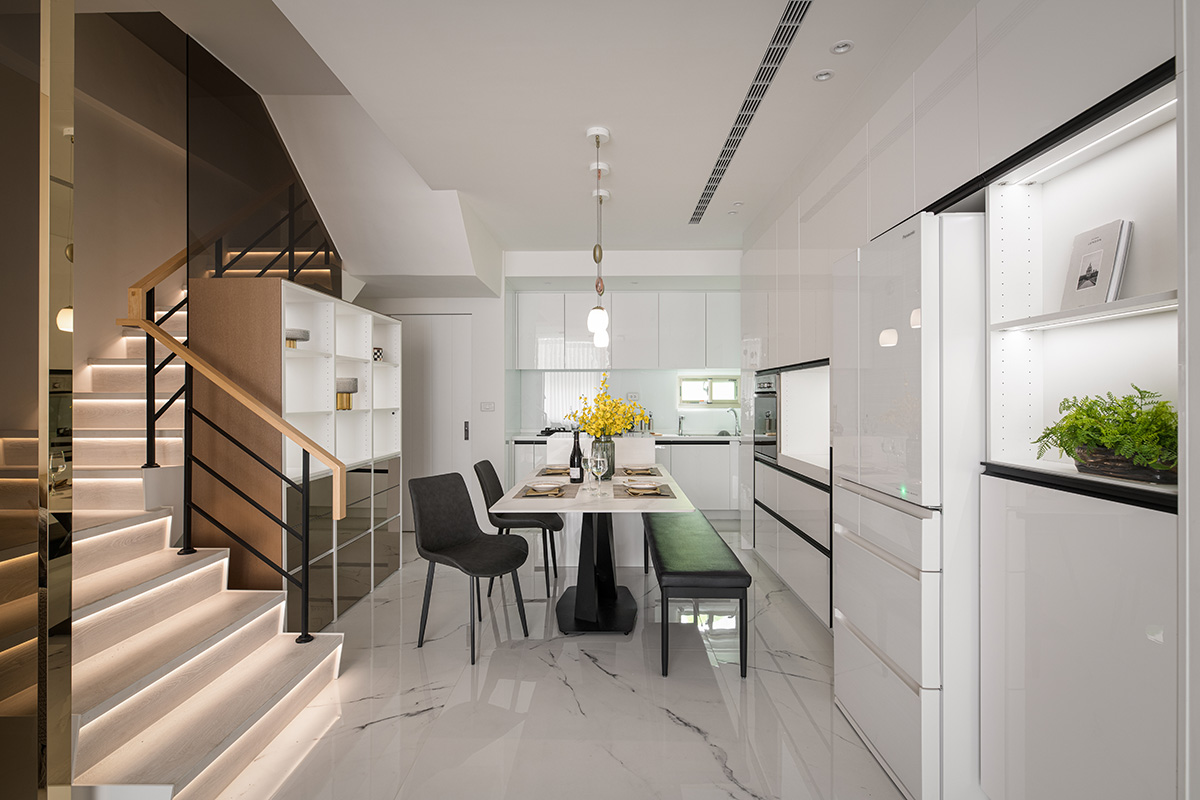 尽管很少在家烹煮三餐,仍期望形塑净白系开放式厨房,予以一座中岛台,串连回字形动线,考量餐厨面宽须让渡予上下楼梯,便将中岛砌为狭长状,宽仅85公分,如此一来,能使柜体尺度达到方便开合状态。