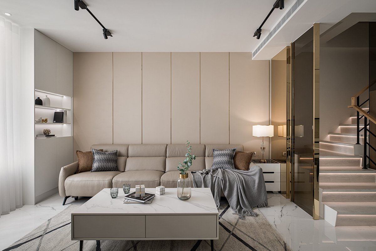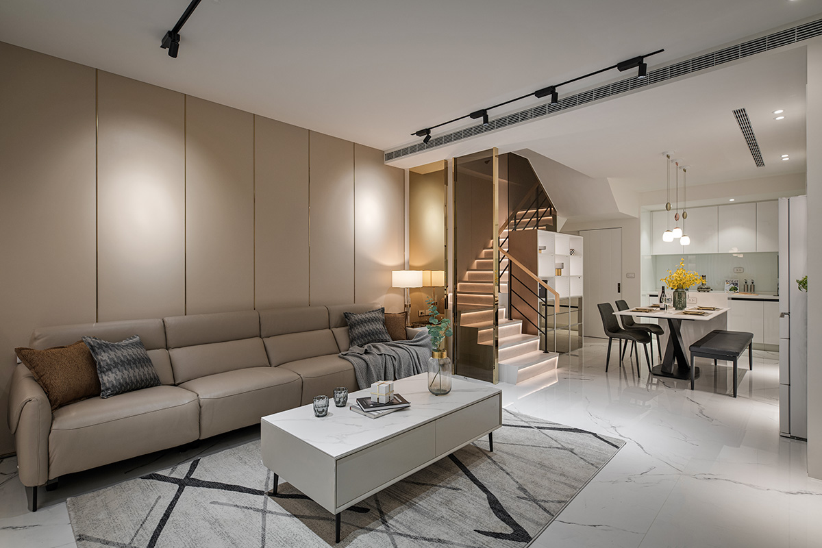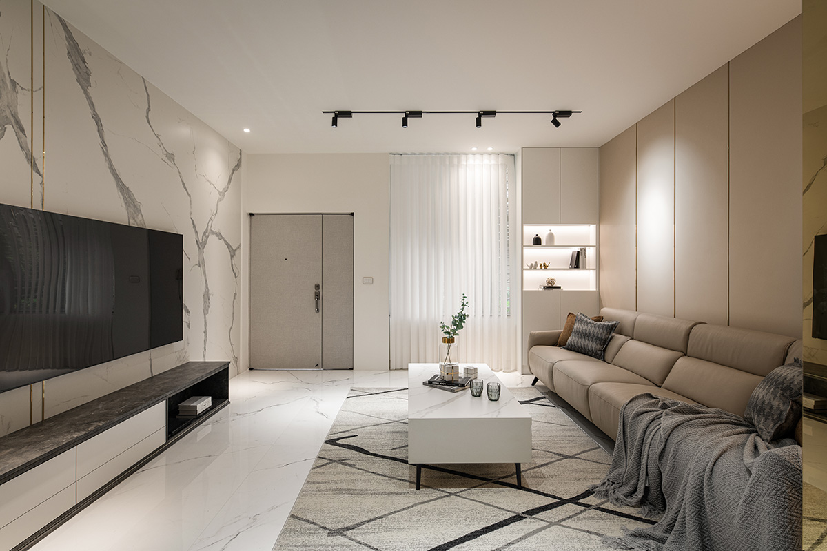 盼让薄板砖有如生墨般的纹理,细致勾动柔和情境,不仅捨弃玄关区域,更以不规则韵律落下镀鈦条,与奶茶色沙发背墙,穿引同样是线性镀鈦之微妙律动,为家人常常相伴场域,创造一种独特轻快节奏感。