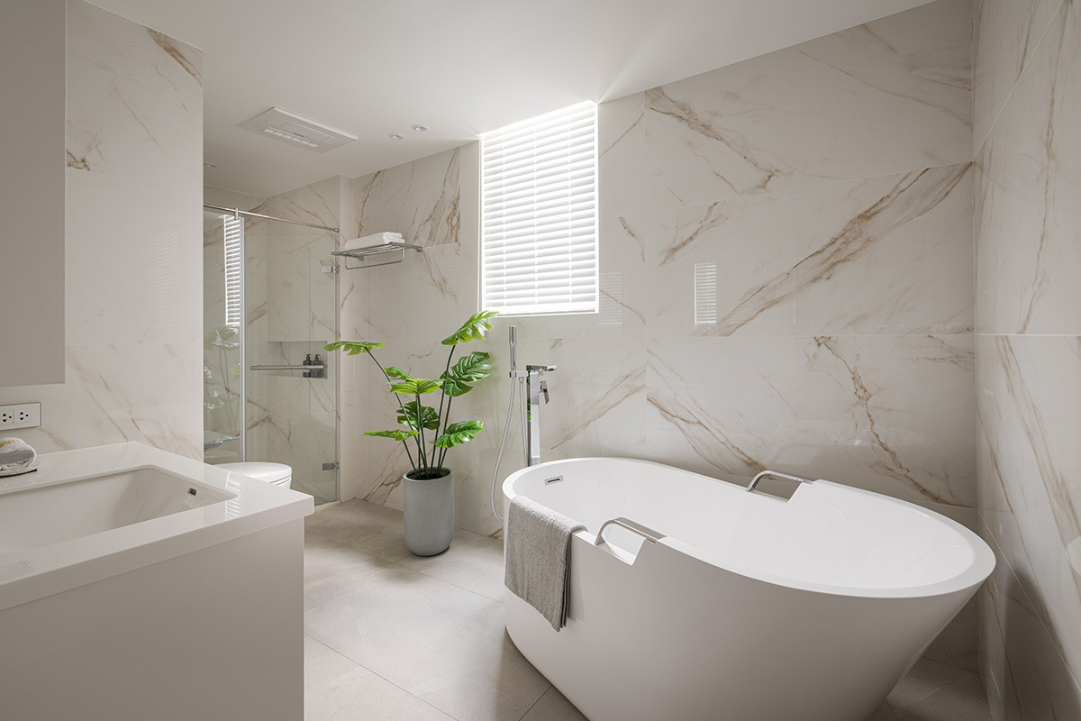 主卫位置调动之后,受限于粪管管线,马桶无法再作挪动,便将屋主期盼的浴缸以斜置角落方式摆放。