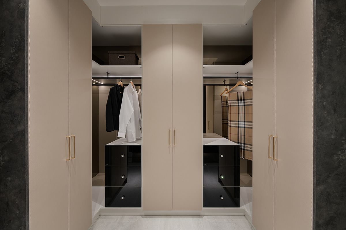 考量衣物量大,更衣室以 ㄇ 字形为收储样态,再引挹一座中岛台,形构回字形动线,延续一楼客厅色系与板材,由淡暖奶茶系为门片,缀饰金属把手,与茶镜兜绕着轻奢气息。