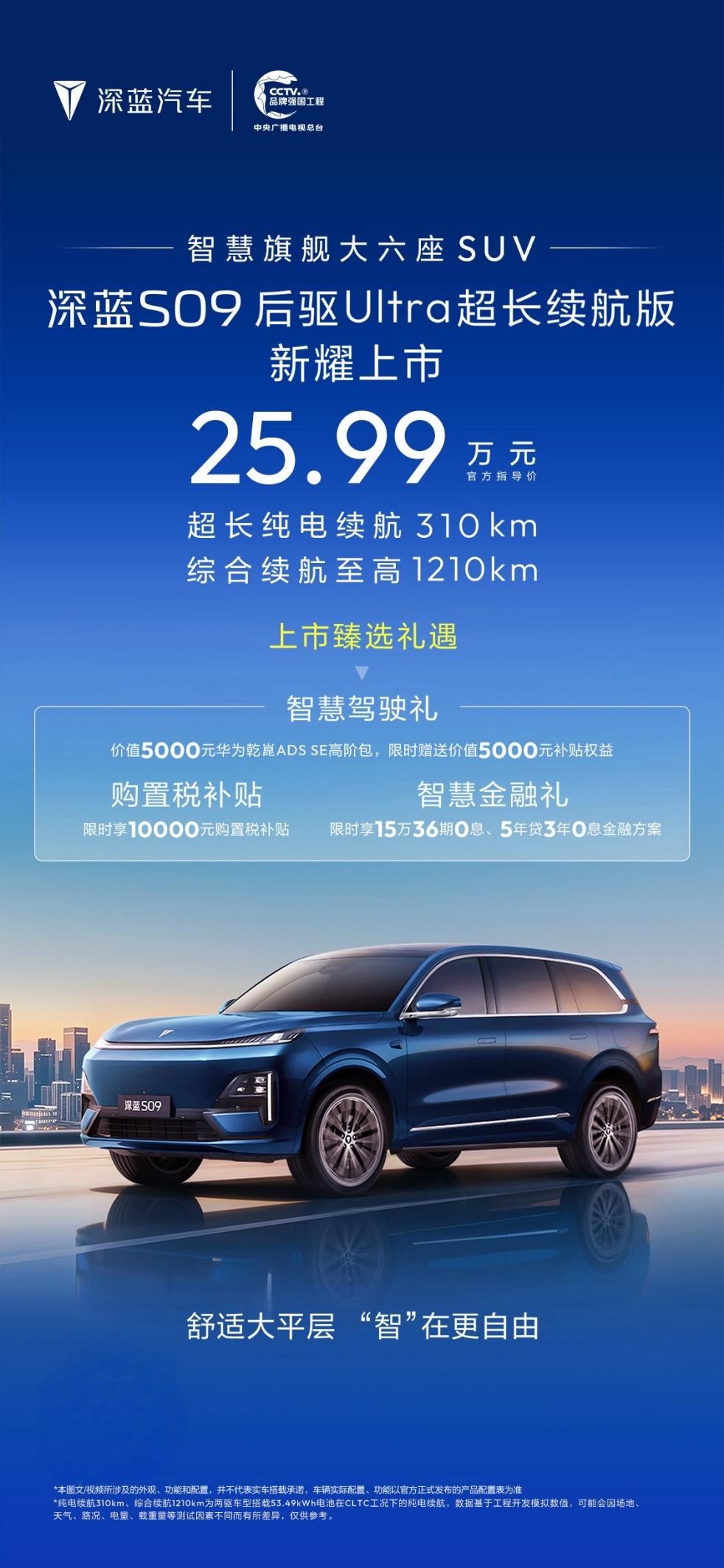 深蓝S09凭借硬核的产品力,不仅进一步提升了续航能力,同时保持高配置水准,其品质与体验匹敌问界、理想等高端品牌的同级别车型,此次后驱Ultra版焕新升级后,续航更长充电更快,以25.99万元的价格上市,现在锁单还可享受限时10000元购置税补贴、5000元换购补贴,限时赠送价值5000元华为乾崑ADS SE高阶包,并赠送价值20000元智慧选装礼,以及价值10000元选装基金,让实际入手价更具诚意。