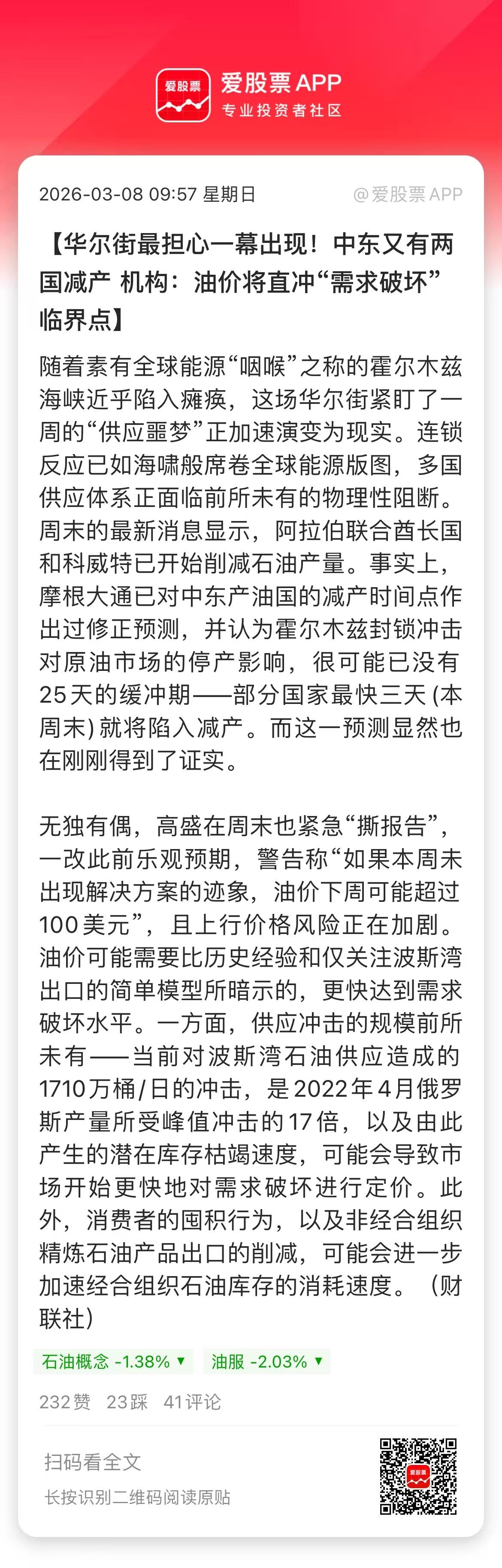 这个周末中东情况有点糟糕,一是国际油价暴涨,布油干到93美元;二是美国科技巨头首次成战场目标,这对AI科技牛是雪上加霜! 从双方发声看,特朗普态度强硬,要伊朗无条件投降;伊朗说绝对不会投降,并且在为战争持续6个月做准备。这就有点让川普骑虎难下了,很可能把闪电战拖成持久战。这对于油价和全球股市,绝对不是好消息。 当然,昨晚双方也开始说一些软话了。先是伊朗向领国道歉,承诺不再向它们开火;然后川普接话说,“这都是我们的功劳,果然老川还是赢了”! 伊朗现在手头的筹码,一方面封锁封禁霍尔木兹海峡,另一方面就是将中东各大油田全炸了。这样全球油价狂飙到100美元、120美元都是有可能的。原油作为大宗商品之母,如果长期在高位,那对全球经济都是灾难。 对A股来说,明天油气板块肯定是高开,还有就是航运、无人机之类的了。但高开之后怎么走不知道,一方面看消息的刺激,一方面看期货价格的反馈。另外如果油价继续狂飙,资金可能选择相对低位的新能源(风光储),这个逻辑还是通顺的。 还有一条暗线就是涨价,大致的传导逻辑是:原油→炼油工程设备→化工原料→海运物流→农产品种业→棉花、大豆!油气板块已经涨了不少,化肥、农产品这些有补涨的空间,同时也是防守型板块。